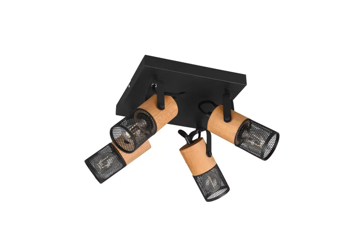 Der moderne Mix aus Metall und Holz wirkt zeitlos und liegt absolut im Trend. Die Kombination mit Naturmaterialien ist aus modernen Wohnräumen nicht mehr wegzudenken und sorgt zudem für ein gemütliches Wohnambiente. Der 4er Spot TOSH ist also die ideale Wahl, um in Wohnräumen ein perfektes Lichtergebnis zu schaffen. Die einzelnen Spots können individuell ausgerichtet werden und eignen sich dadurch ebenfalls zur Ausleuchtung bestimmter Bereiche. Metall in Schwarz matt zusammen mit den Holzelementen findet sich in modernen und minimalistischen Einrichtungsstilen wieder. Für eine energiesparende Beleuchtung empfiehlt sich die Verwendung eines LED Leuchtmittels. Diese sind eine optimale Alternative zu herkömmlichen Halogen Leuchtmitteln und stehen für eine hohe Lichtqualität und eine Energieeinsparung von bis zu 80%. Zusätzlich profitieren Sie bei LED Leuchtmitteln von einer langen Lebensdauer, einer geringen Wärmeentwicklung und schonen gleichzeitig die Umwelt.
