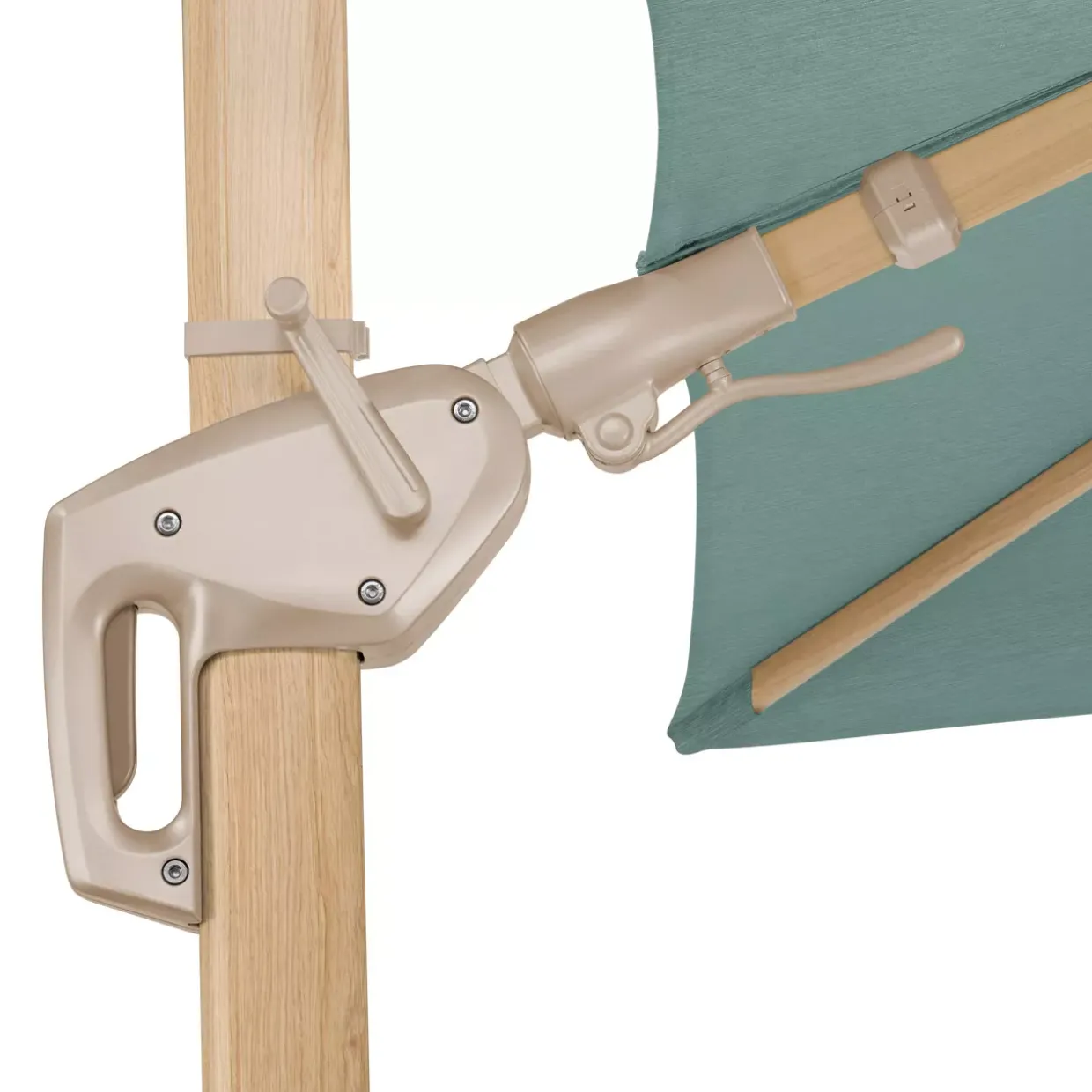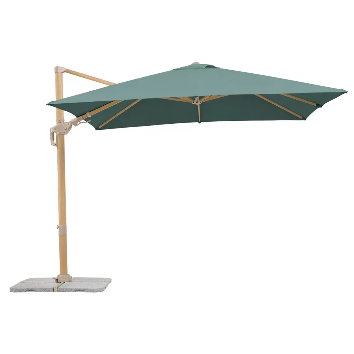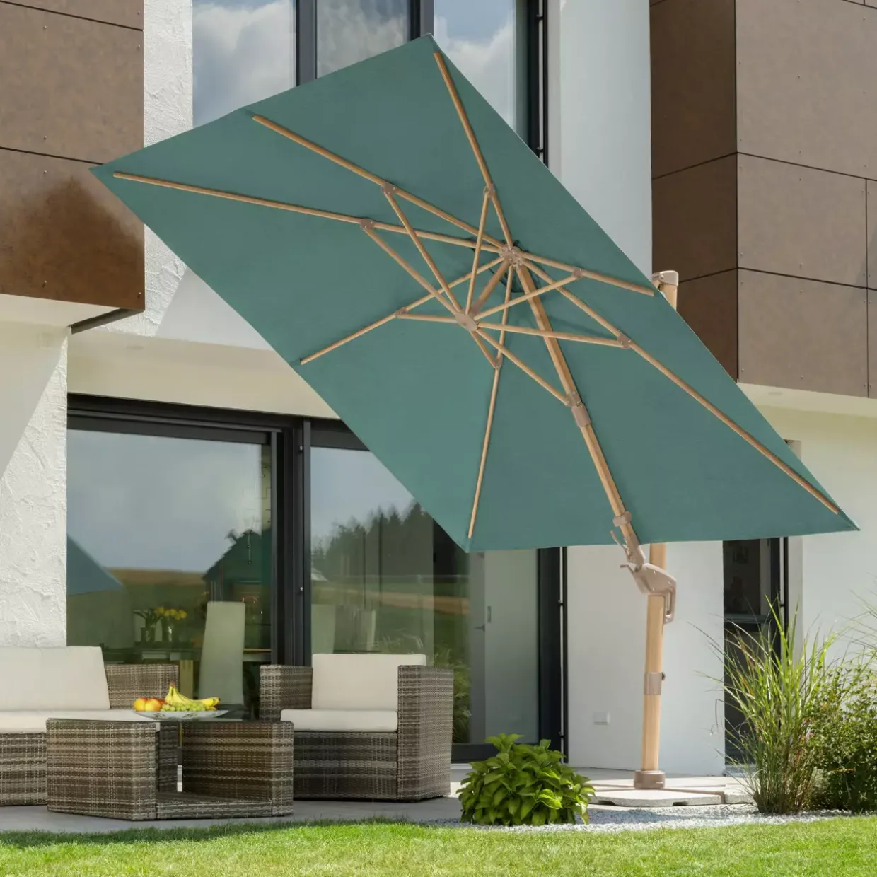 Ein Hauch von Leinenstruktur verleiht dem Sonnenschirm Rhodos Twist Loft eine moderne Eleganz, die sich nahtlos in jede stilvolle Umgebung einfügt. Die harmonische Kombination aus holzoptik und grün schafft eine natürliche Atmosphäre, die zum Entspannen einlädt.