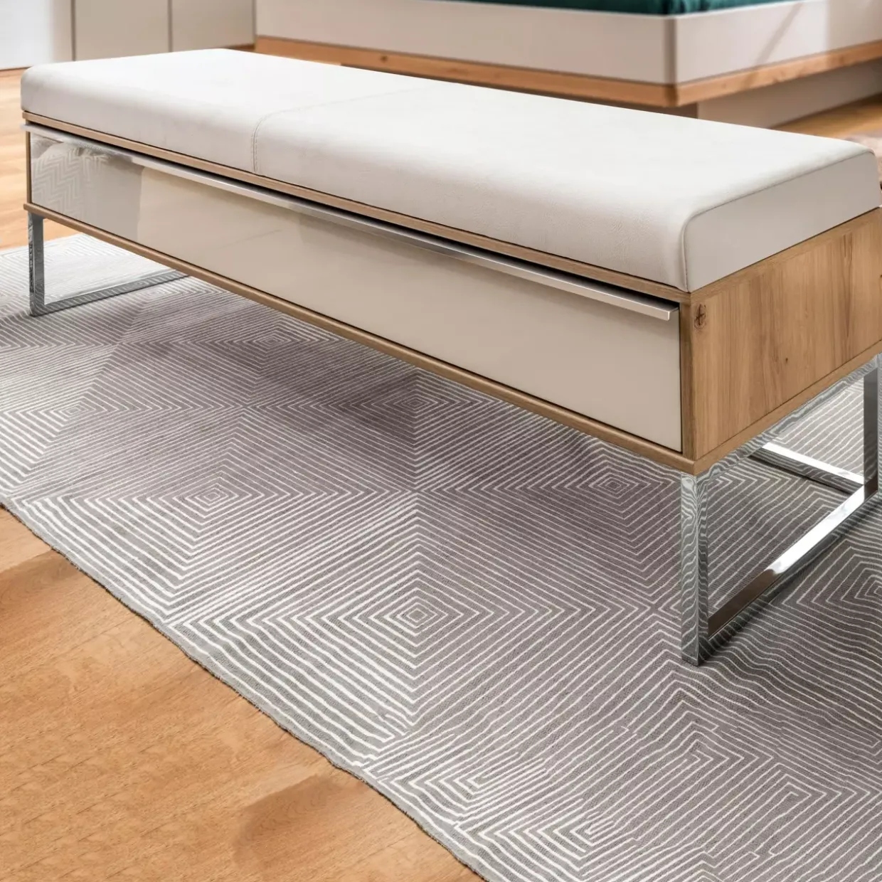 Eiche Nachbildung trifft auf modernes Design: Die Barcelona Ankleidebank vereint stilvolle Ästhetik mit funktionalem Nutzen. Warme Erdtöne in Kombination mit champagnerfarbenen Akzenten verleihen jedem Raum eine elegante Atmosphäre. Der Einsatz von Glas und Holzwerkstoff als Materialien sorgt nicht nur für eine ästhetische Vielfalt, sondern auch für eine langlebige und stabile Konstruktion.Mit der modernen Gestaltung passt die Ankleidebank nahtlos in verschiedene Einrichtungsstile und bietet gleichzeitig eine praktische Lösung für Stauraum. Sie können Ihre Kleidung oder Accessoires bequem aufbewahren, während Sie sich auf einer stabilen und dennoch stilvollen Sitzfläche niederlassen. Der Einsatz von Glas fügt ein Hauch von Transparenz und Leichtigkeit hinzu, während die Holzwerkstoffoberfläche eine warme und einladende Optik vermittelt.Besonders in kleineren Räumen kann die Barcelona Ankleidebank ihre volle Wirkung entfalten, da sie sowohl als Sitzgelegenheit als auch als Aufbewahrungsmöbel dient. Funktionalität und Design gehen hier Hand in Hand, um Ihnen ein Produkt zu bieten, das Ihren Alltagsbedürfnissen gerecht wird. Ob im Schlafzimmer, Ankleidezimmer oder Flur – diese Ankleidebank fügt sich harmonisch in Ihre Einrichtung ein und bietet gleichzeitig praktischen Nutzen.