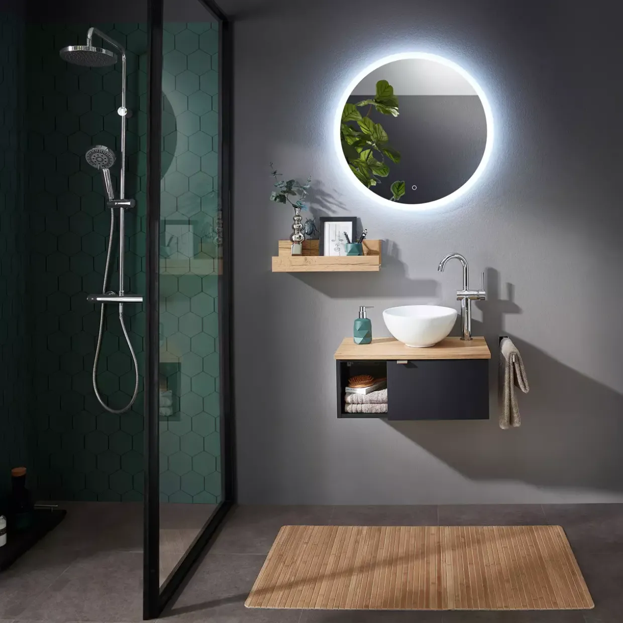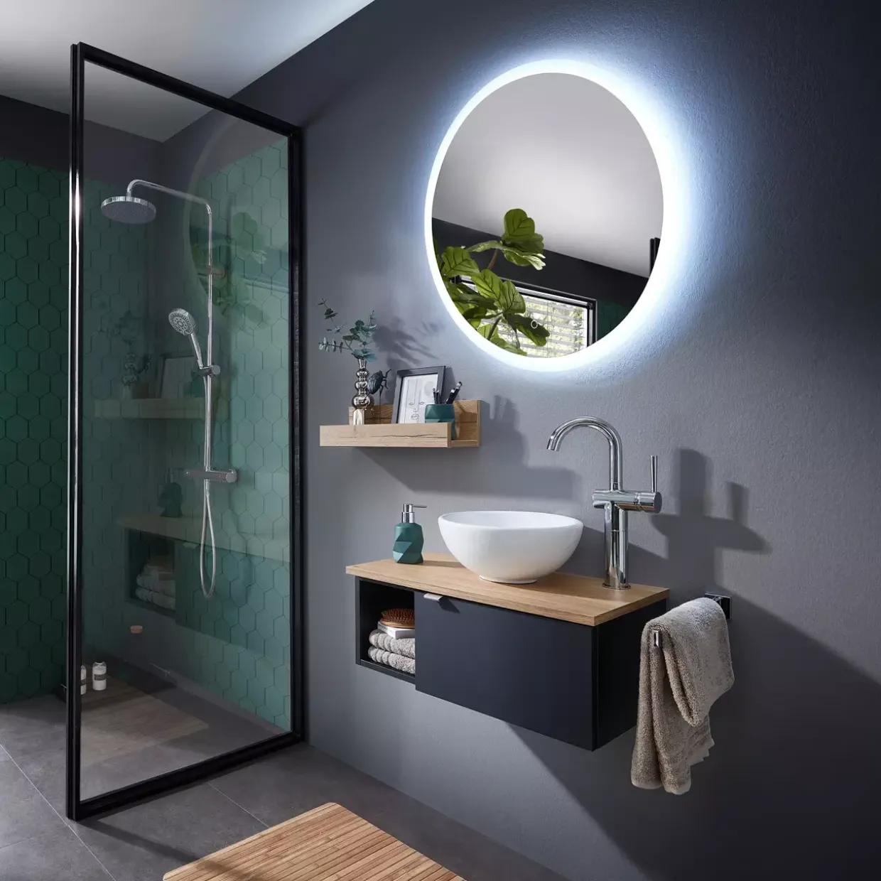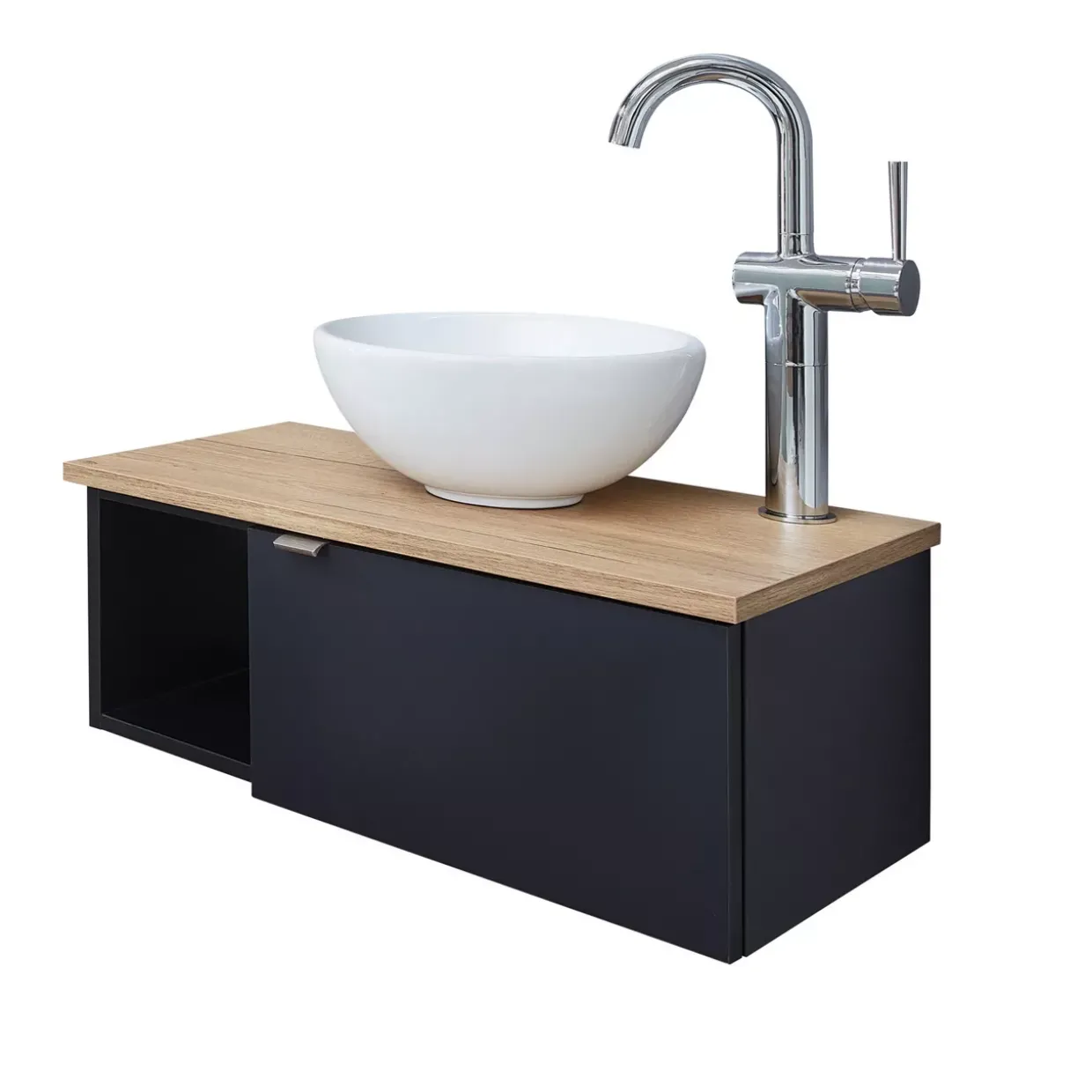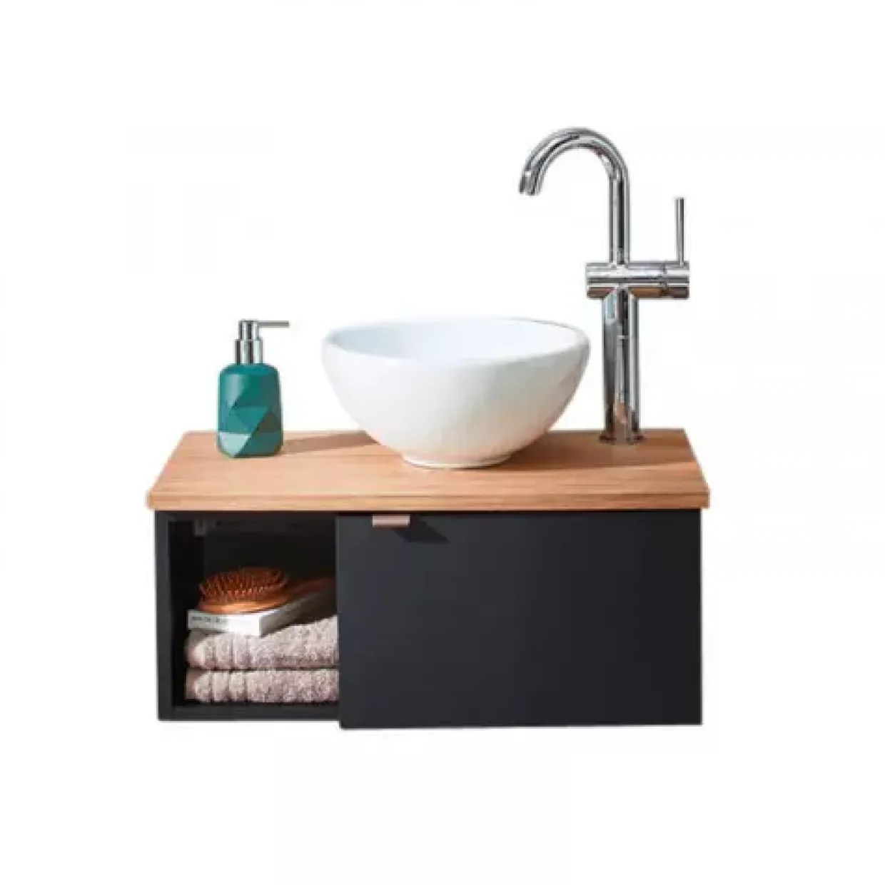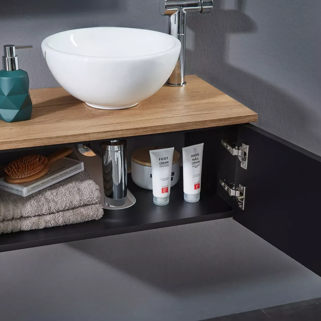 Die Serie Havanna ist vor allem für Gästebäder und Gäste-WCs die perfekte Lösung. Der platzsparende Waschplatz wird mit seinem raffinierten Design zum Blickfang. Auffällig ist in erster Linie die farbig abgesetzte Waschtischplatte in Eiche Hallifax Nachbildung. So kommt der Dekor in Schwarz matt Touch besonders gut zur Geltung. Zudem bietet die zusätzliche Ablage Platz für kleine Utensilien.