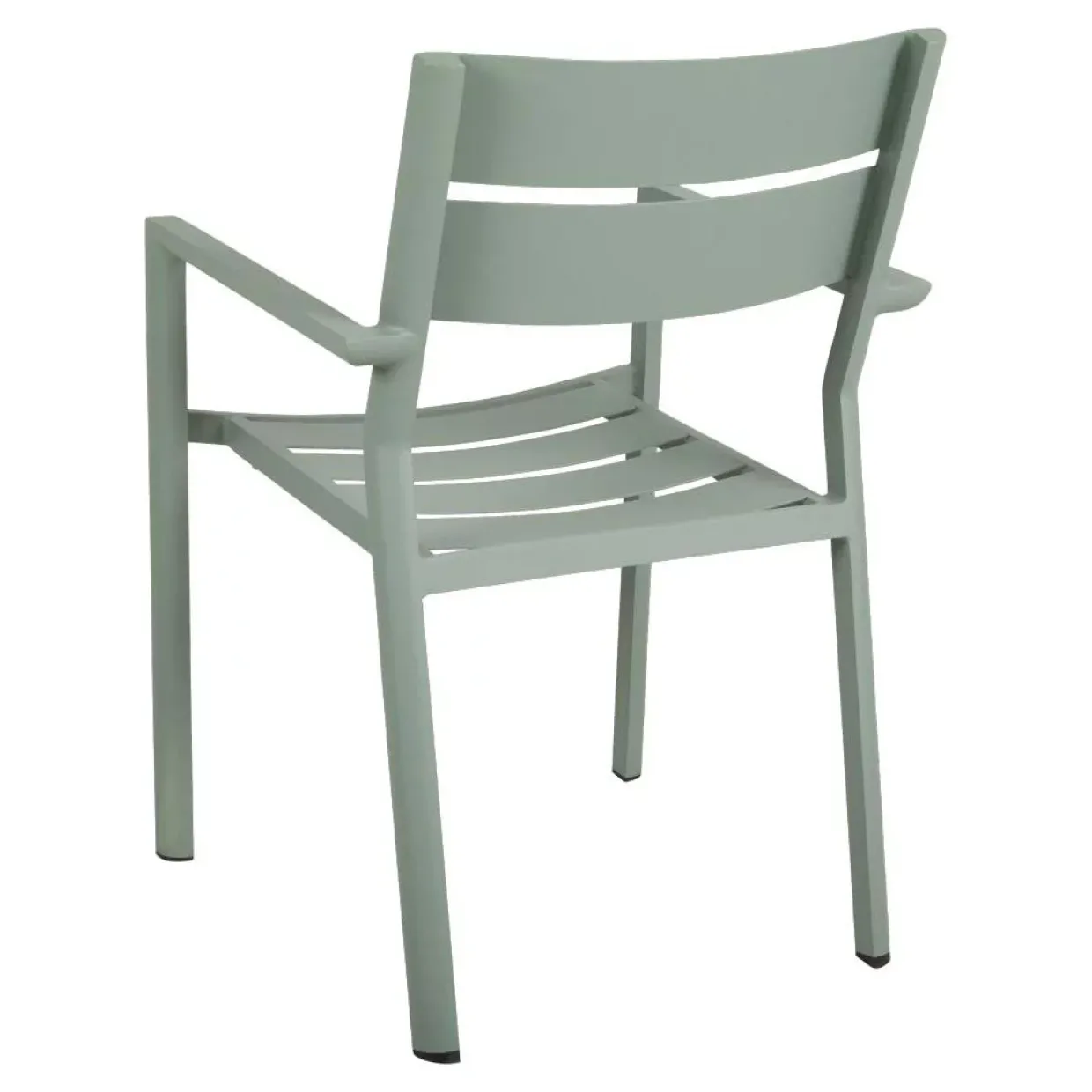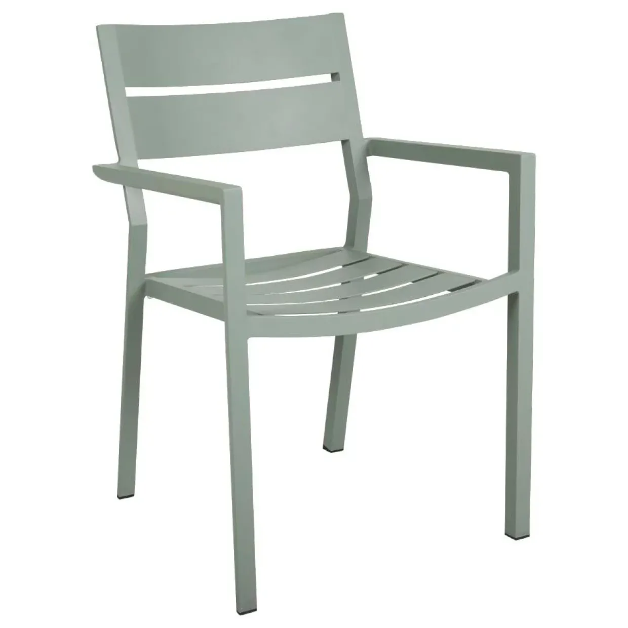 Eine pulverbeschichtete Oberfläche verleiht dem Delia Stuhl mit Armlehne in Dusty Green nicht nur eine ansprechende Ästhetik, sondern auch eine widerstandsfähige Schutzschicht gegen Witterungseinflüsse. Im skandinavischen Stil gestaltet, fügt sich dieser Stapelstuhl harmonisch in jede Outdoor-Umgebung ein. Das verwendete Aluminium macht den Stuhl leicht und dennoch robust, ideal für den Einsatz im Freien.
