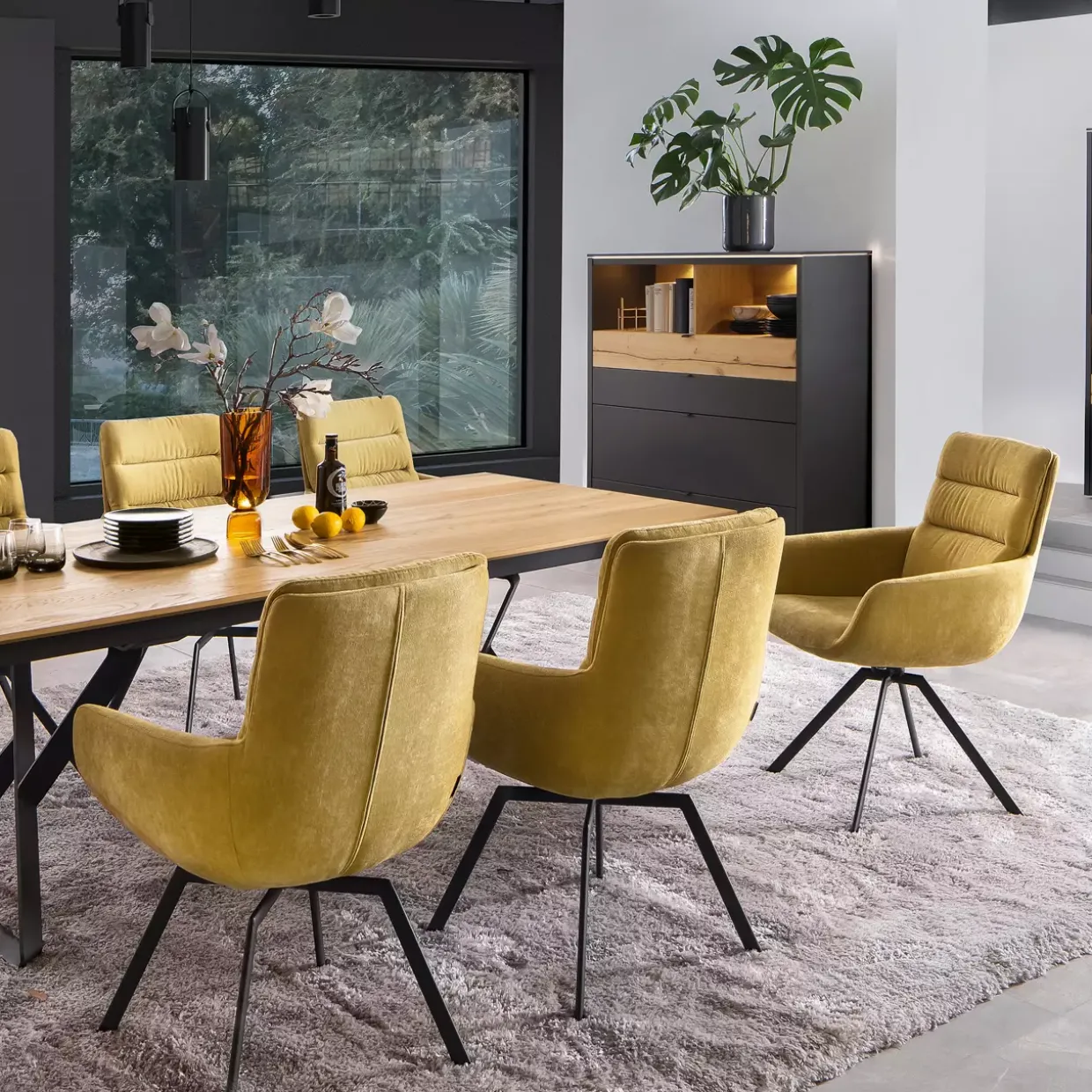 Die Sitzschale des Felia Stuhls mit Armlehnen bietet dank des Polstersitzes einen außergewöhnlichen Komfort. Modern und elegant zugleich, wird dieses Möbelstück in den Farben Gelb und Anthrazit matt angeboten, was es zu einem stilvollen Hingucker macht. Das 4-Fußgestell aus Metall sorgt für Stabilität und Beständigkeit, während der Stoffbezug eine einladende Atmosphäre schafft.