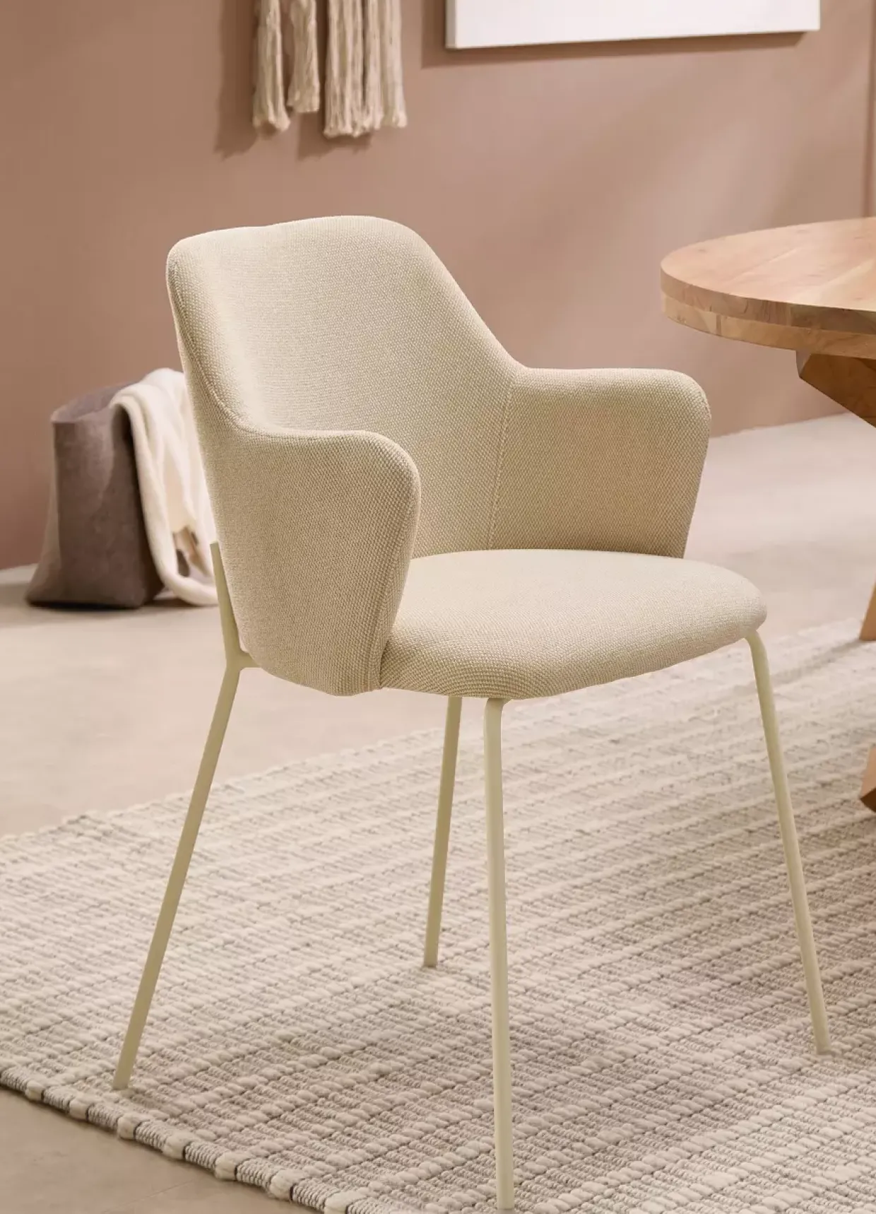 Stilvoll und konventionell präsentiert sich der Lissi Armlehnstuhl in einer harmonischen Kombination aus Strukturstoff in Beige und Creme. Das edle Polyestergewebe verleiht dem Stuhl nicht nur eine angenehme Haptik, sondern auch eine beeindruckende Langlebigkeit. Mit seinem soliden 4-Fußgestell aus Metall garantiert er Stabilität und eine moderne Optik, die sich nahtlos in verschiedene Raumkonzepte einfügt.