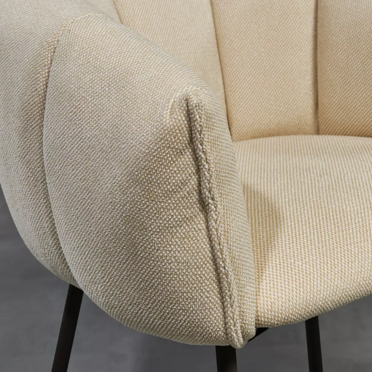 Die Kombination aus Strukturstoff in einem sanften Beige und eleganten schwarzen Akzenten bietet eine harmonische Ergänzung zu jeder Einrichtung. Die hochwertige Pulverbeschichtung der Metalloberfläche sorgt für zusätzliche Langlebigkeit und ein ansprechendes Erscheinungsbild.
