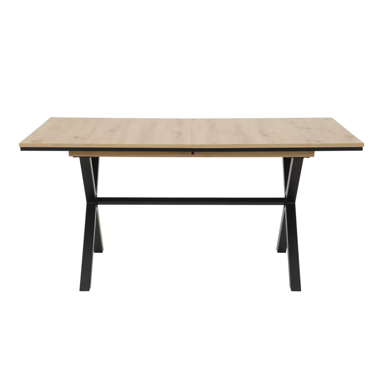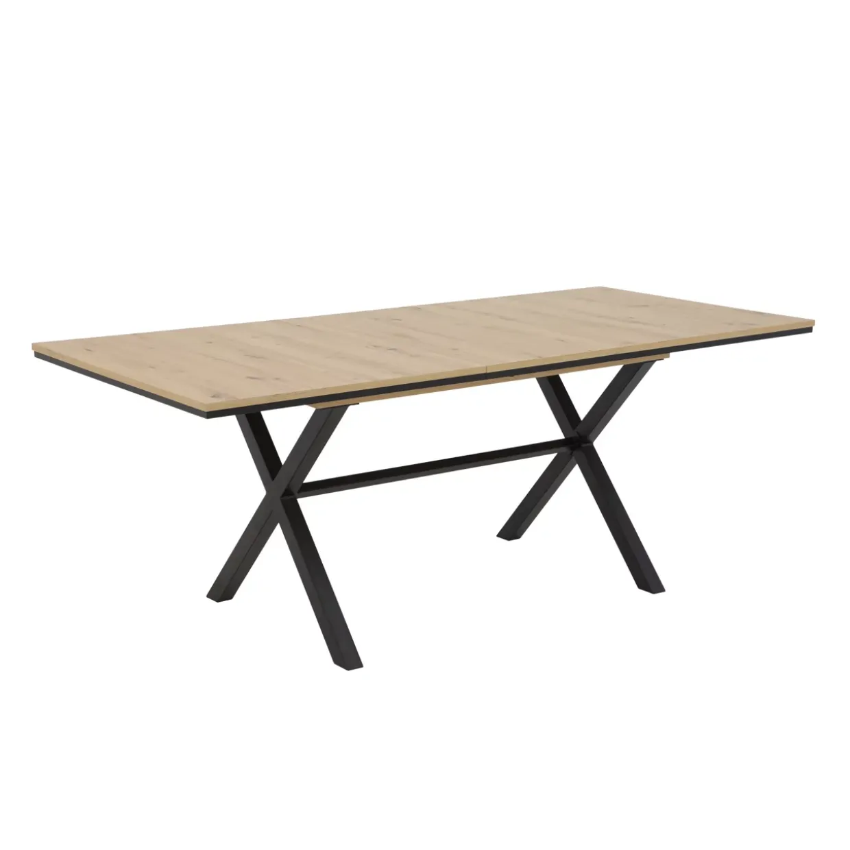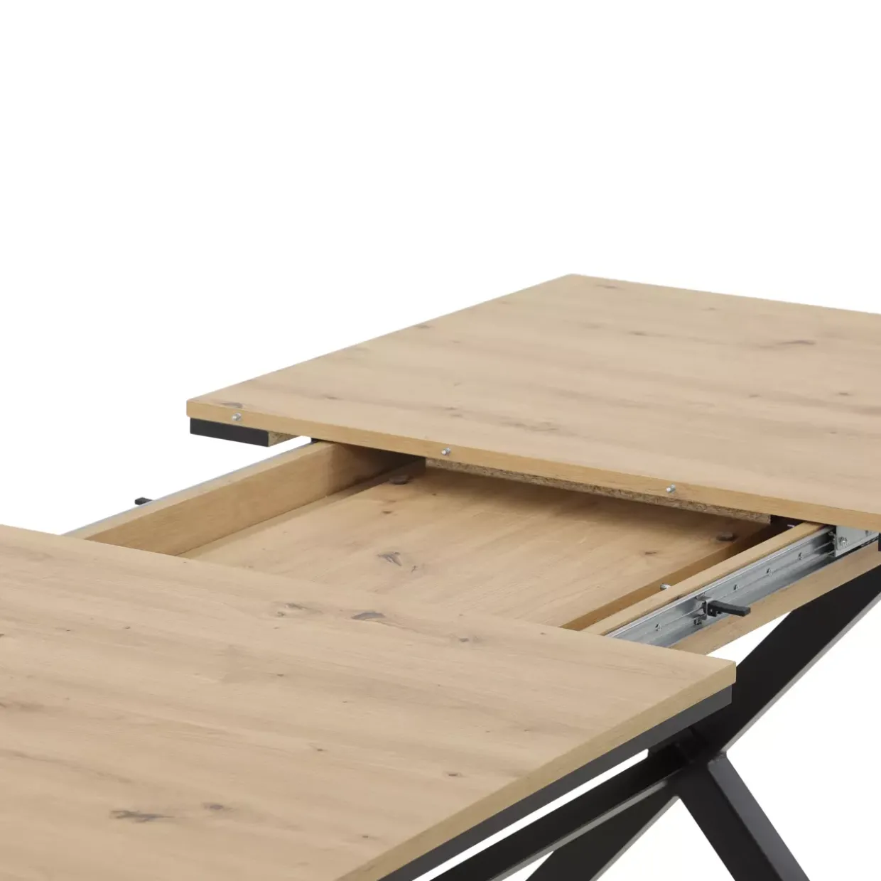 Ein stilvolles Design in Schwarz kombiniert mit einer Oberfläche in Artisan Eiche Nachbildung verleiht jedem Raum eine elegante Note. Die harmonische Verbindung aus Holzwerkstoff und Metall sorgt für Stabilität und eine ansprechende Optik. Besonders markant ist die X-förmige Fußkonstruktion, die dem Tisch einen modernen und zugleich stabilen Stand verleiht.