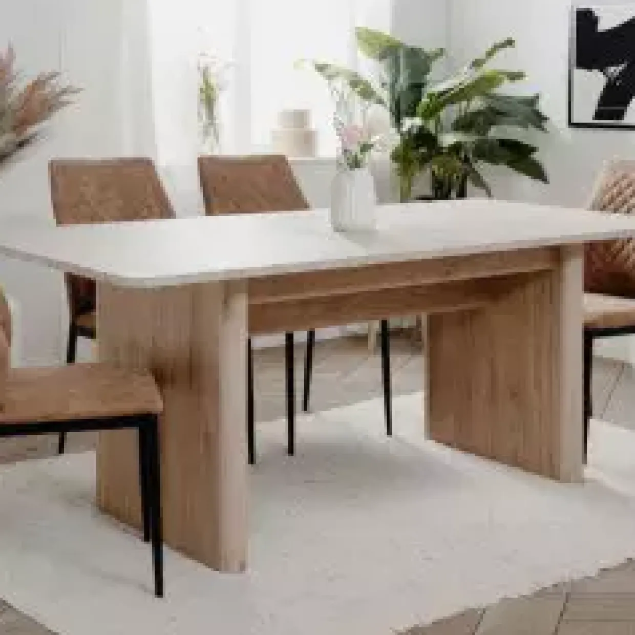 Sandsteinfarben erstrahlt der Auszugstisch Sai, ein wahres Schmuckstück im Scandi-Stil. Der Tisch vereint natürliche Materialien mit klaren Linien und schafft so eine Atmosphäre der Ruhe und Eleganz in Ihrem Zuhause. Stein als gewähltes Material verleiht ihm nicht nur Stabilität, sondern auch eine zeitlose Ästhetik, die in jedem Raum beeindruckt.