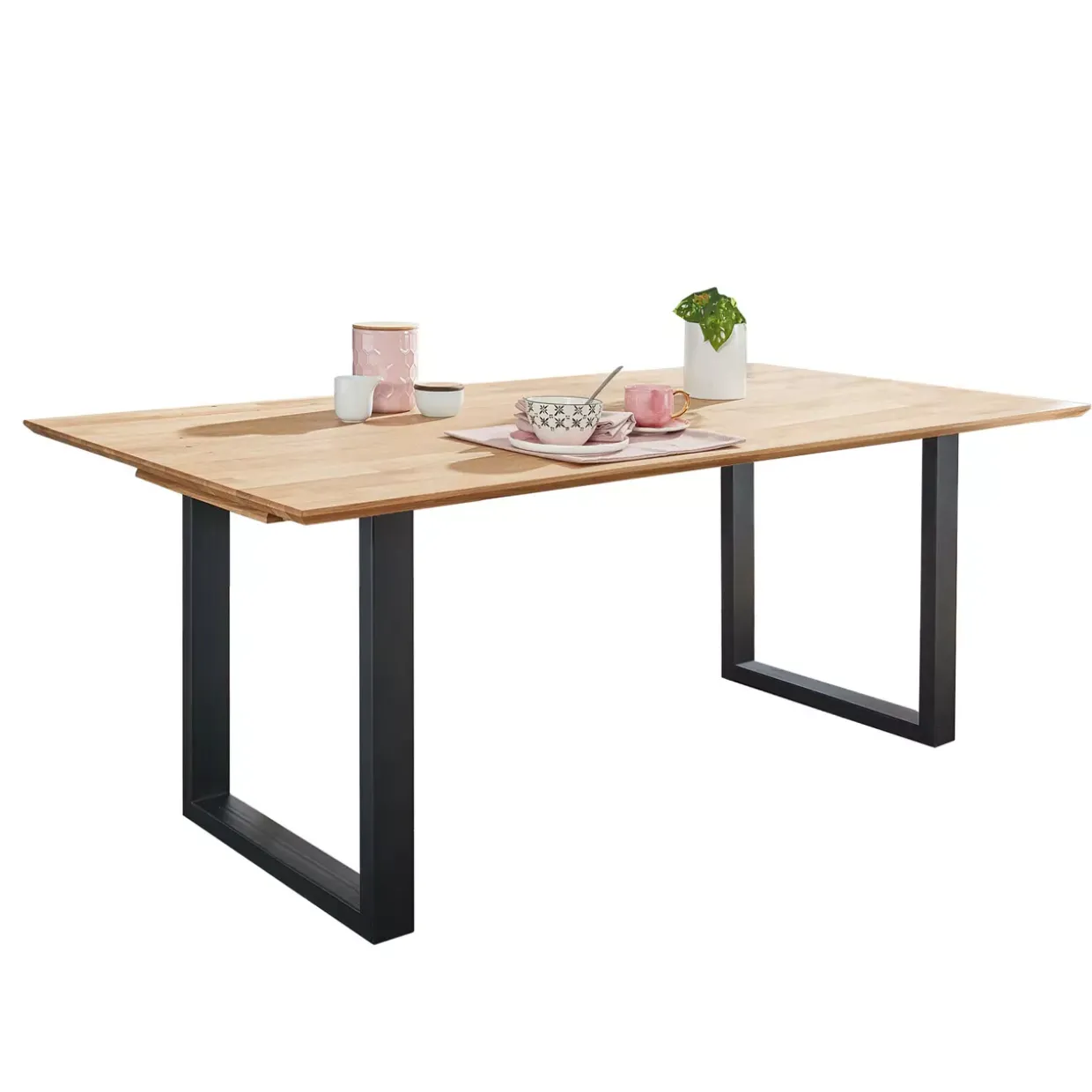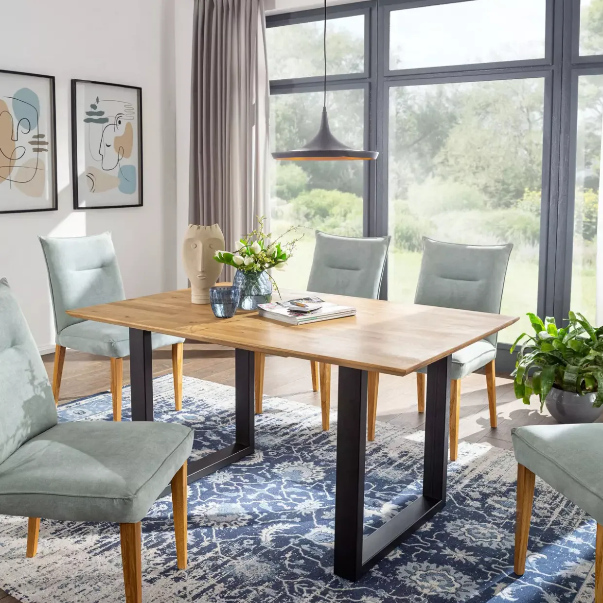 Mit seiner klaren Linienführung und der charakteristischen Kufengestaltung der Füße fügt sich der Tisch nahtlos in moderne Wohnkonzepte ein. Die natürliche Wildeiche verleiht jedem Raum eine warme und einladende Atmosphäre, während die schwarzen Akzente aus Metall einen interessanten Kontrast bieten, der das Design hervorhebt.