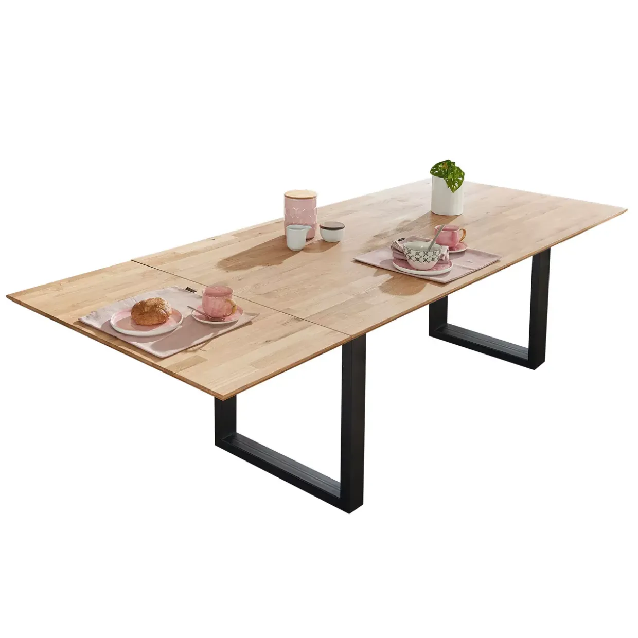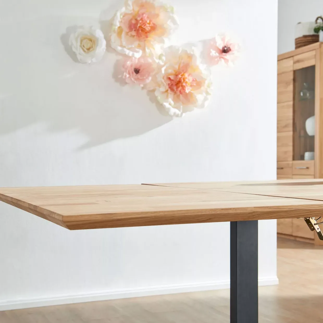 Ein schwenkbarer Auszug definiert den modernen Auszugstisch als funktional und praktisch. Erleben Sie die harmonische Kombination aus robustem Metall und edlem Wildeichenholz, die sich in diesem Meisterwerk vereinen. Die parkettverleimte Oberfläche strahlt eine natürliche Eleganz aus und ist geölt, um die Langlebigkeit und den natürlichen Glanz des Holzes zu bewahren.