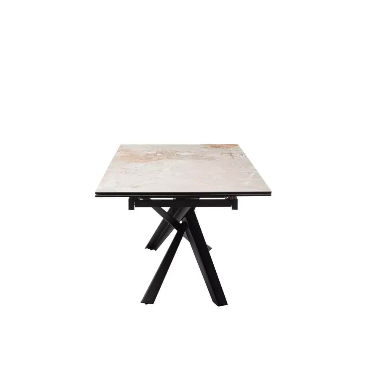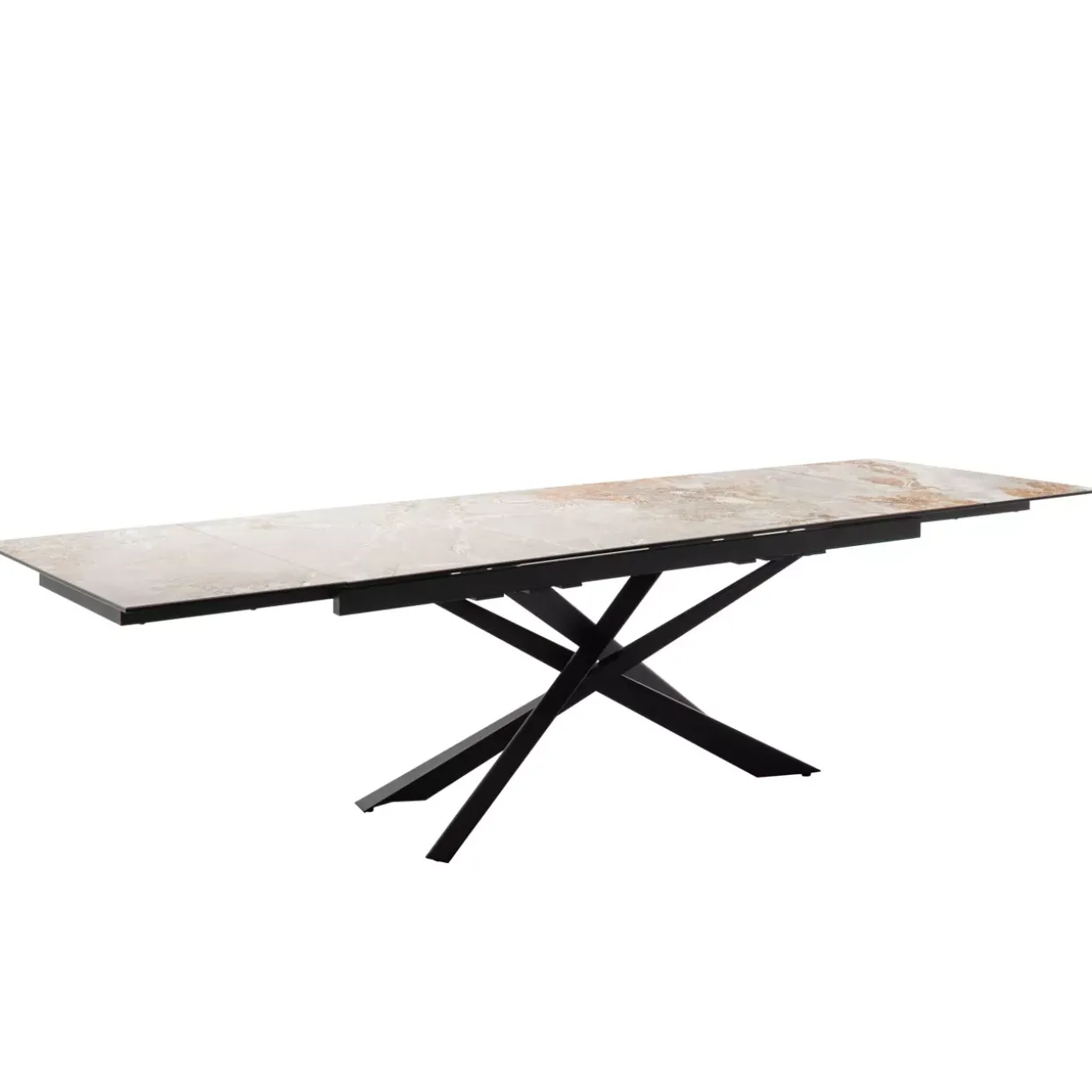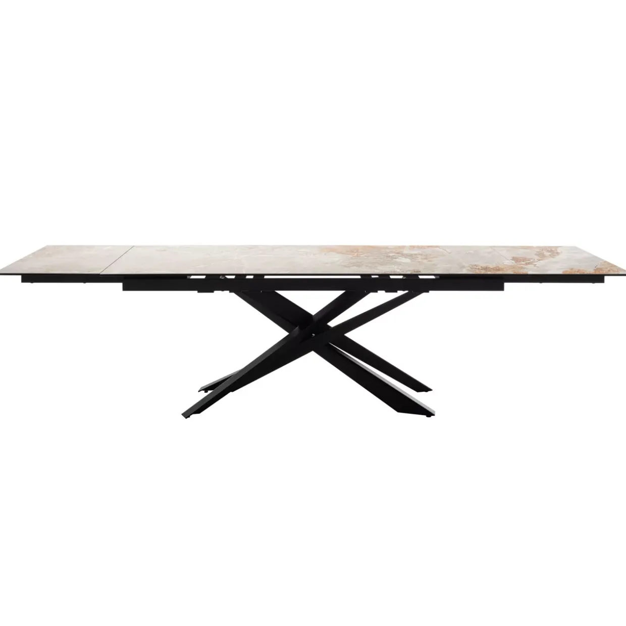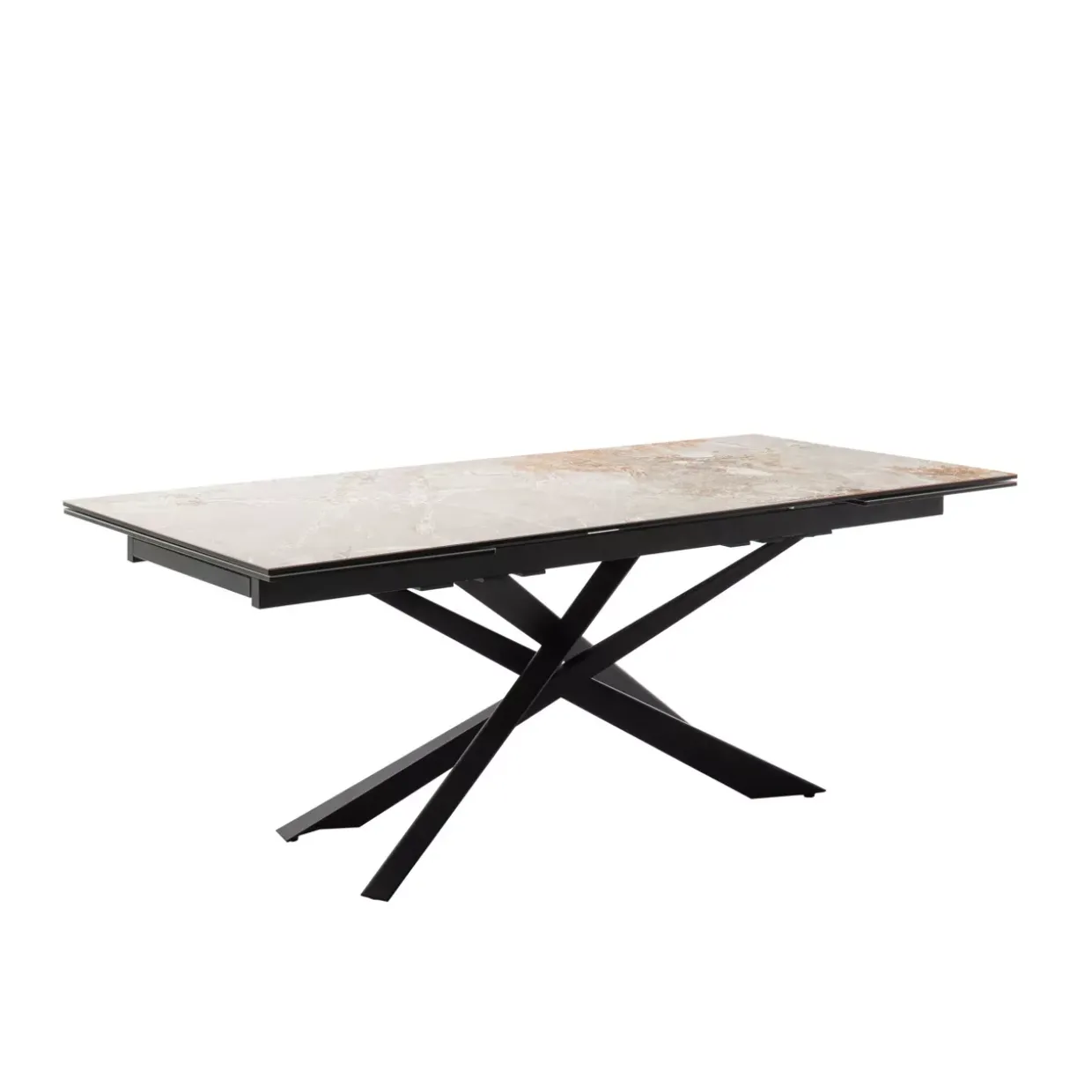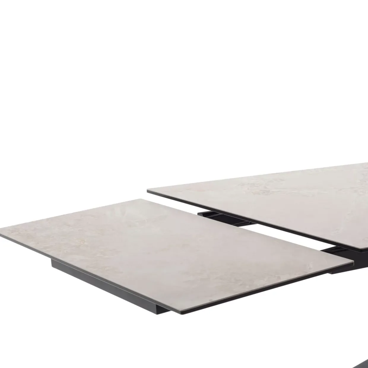 TESERO Auszugtisch 200 (300) cmEin Highlight für jeden Essbereich: Der Auszugtisch, der auf beeindruckende 300 cm erweiterbar ist. Diese Flexibilität wird durch den cleveren Stirnauszug ermöglicht, der sich nahtlos in das konventionelle Design einfügt. Die Tischplatte besteht aus einer eleganten Kombination von Keramik und schwarz lackiertem Sicherheitsglas mit einer Stärke von 13 mm. Mit einer harmonischen Farbpalette aus schwarz matt, grau marmoriert und schwarz lackiert fügt sich der Tisch perfekt in jedes Ambiente ein. Das robuste 4-Fußgestell aus Metall sorgt für Stabilität und ergänzt das edle Erscheinungsbild. Der Tisch bietet nicht nur optische, sondern auch funktionale Vorteile. Die Oberfläche ist lackiert, was nicht nur die Ästhetik unterstreicht, sondern auch für eine pflegeleichte Handhabung sorgt.Die Verbindung von Glas, Metall und Keramik vereint moderne Eleganz mit zeitloser Beständigkeit. Diese Materialwahl gewährleistet nicht nur Langlebigkeit, sondern auch eine stilvolle Präsentation bei jedem Anlass. Ob für ein gemütliches Abendessen oder eine größere Feier: Der Auszugtisch bietet ausreichend Platz und setzt gleichzeitig dekorative Akzente. Ein Möbelstück, das sowohl durch Design als auch durch Funktionalität überzeugt und jedem Raum eine besondere Note verleiht.