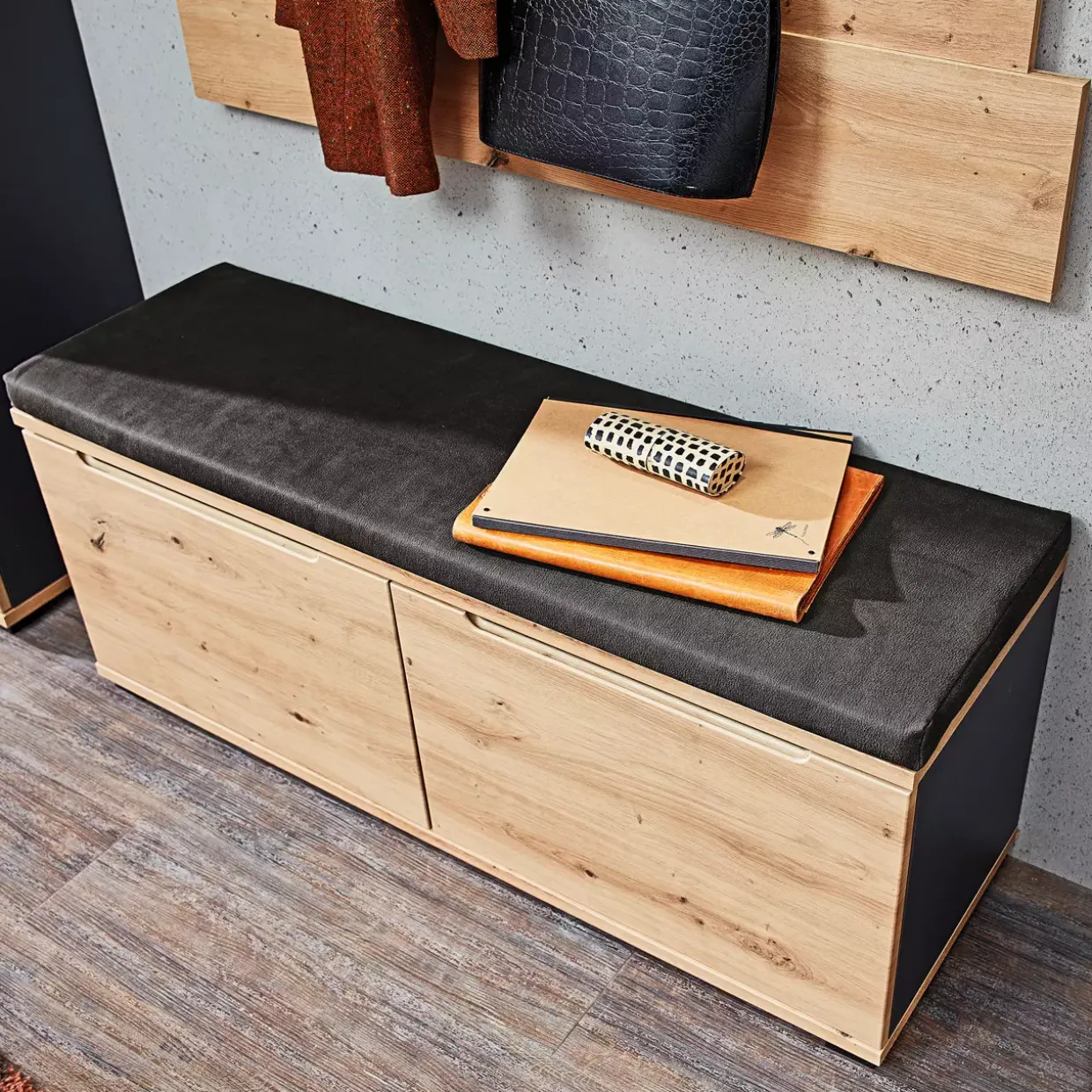 SEDEO6050 Bank m. Kissen graphit/Artisan Eiche B/H/T ca. 120/50/38 cmGraphit und Artisan Eiche vereinen sich in harmonischer Eleganz in diesem modernen Möbelstück. Die Sedeo Bank mit dem Modellnamen Sila bietet nicht nur ästhetische Raffinesse, sondern auch funktionale Vorzüge. Die grifflosen Drehtüren, gefertigt aus hochwertigem Holzwerkstoff, verleihen diesem Design ein nahtloses Erscheinungsbild, das sich perfekt in zeitgenössische Wohnräume einfügt.Gerade die Türdämpfer sind ein Merkmal, das für reibungslose und leise Funktionalität sorgt. Sie schließen die Türen sanft und ohne störende Geräusche, was besonders in offenen Wohnkonzepten von Vorteil ist. Eine komfortable Nutzung wird durch diese durchdachte Technik gewährleistet.Ästhetik trifft auf Funktionalität, wenn es um die Sitzgelegenheit geht. Die Bank ist nicht nur ein optisches Highlight, sondern bietet auch mit ihrem bequemen Kissen zusätzlichen Komfort. In Doppelanzahl verfügbar, lässt sich dieses Möbelstück vielfältig einsetzen, sei es im Flur, Wohnzimmer oder Schlafzimmer.Ein Möbelstück, das sich durch seine schlichte und dennoch anspruchsvolle Gestaltung auszeichnet, ist mehr als nur ein funktionales Element. Es ist ein Ausdruck von Stil und Geschmack, der jeden Raum bereichert. Entdecken Sie die Vorteile dieser modernen Einrichtungslösung.