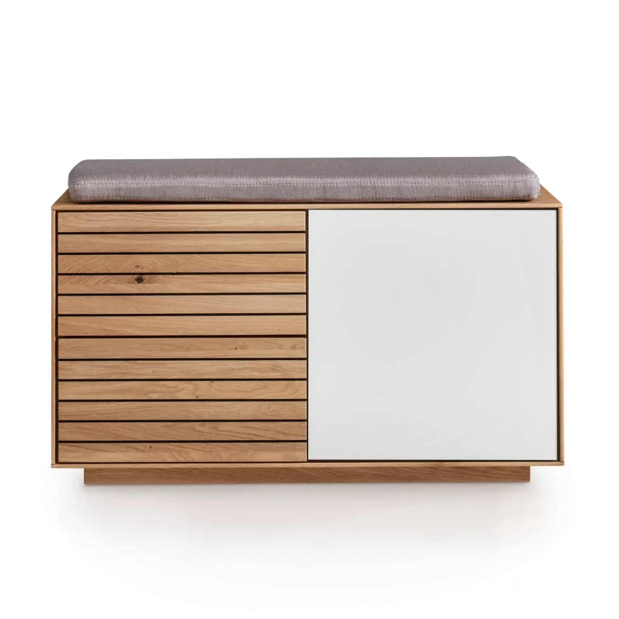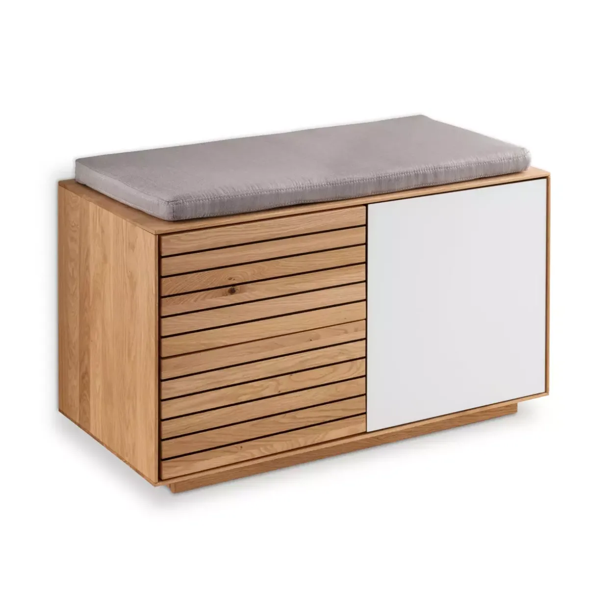 Die Drehtür dieser Bank ist mit der innovativen Push-To-Open-Funktion ausgestattet, die eine mühelose Handhabung ermöglicht. Das Soft-Close-System sorgt dafür, dass die Tür sanft und leise schließt, was den Komfort weiter erhöht. Die melaminharzbeschichtete und geölte Oberfläche verleiht der Bank nicht nur eine ansprechende Optik, sondern schützt auch das Holz und trägt zur Langlebigkeit bei.