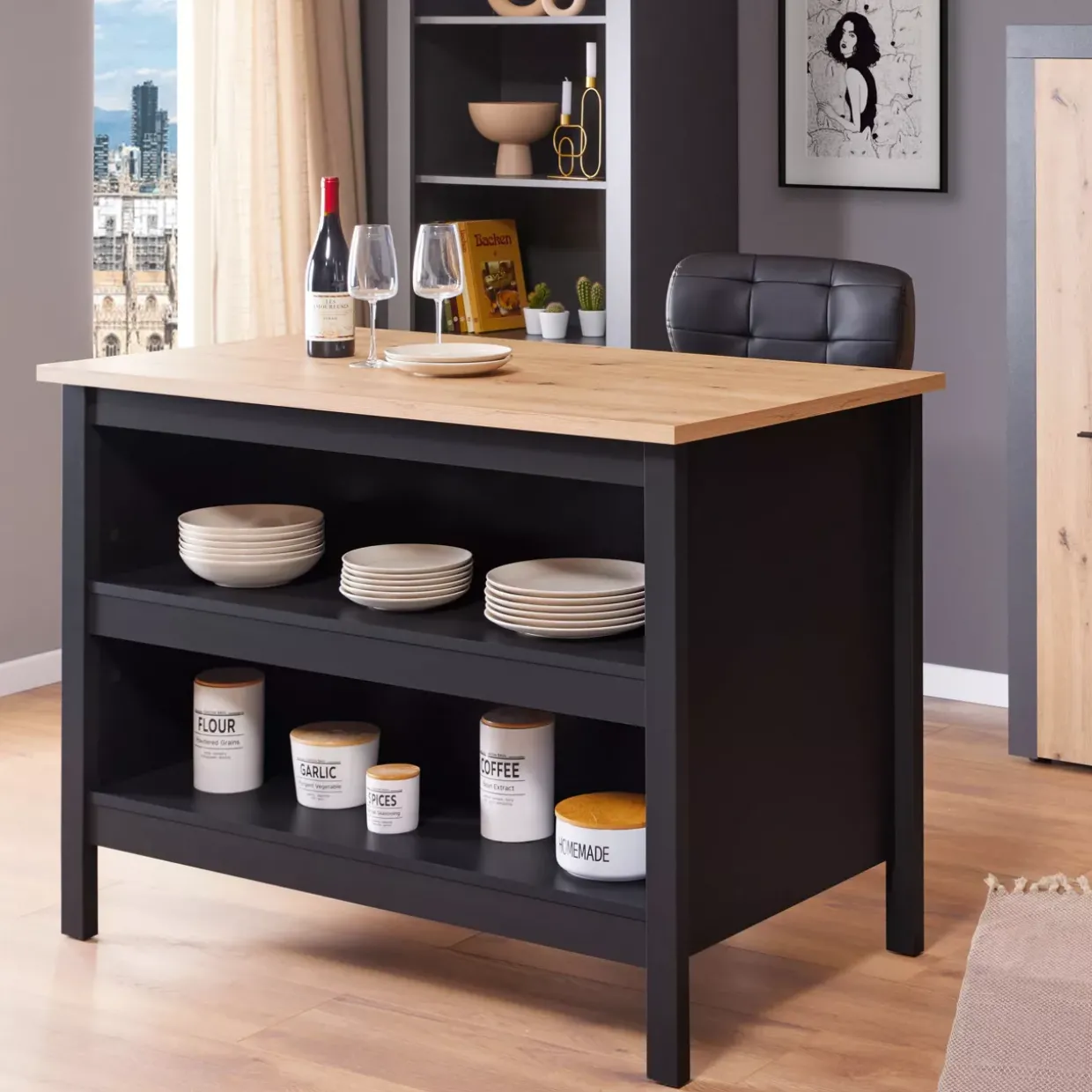 Dieser Bartisch eignet sich hervorragend als Kücheninsel. Er ist er ideal, um zwei hohe Hocker auf einer Seite aufzustellen, sodass Sie dort bequem essen können. Auf der anderen Seite bietet er praktische Aufbewahrungsmöglichkeiten mit zwei breiten Regalen, die viel Stauraum für Geschirr und Küchenutensilien bieten. Der Bartisch „Helina“ ist somit eine perfekte Ergänzung für Ihre Küche, die Funktionalität und Ästhetik harmonisch vereint.