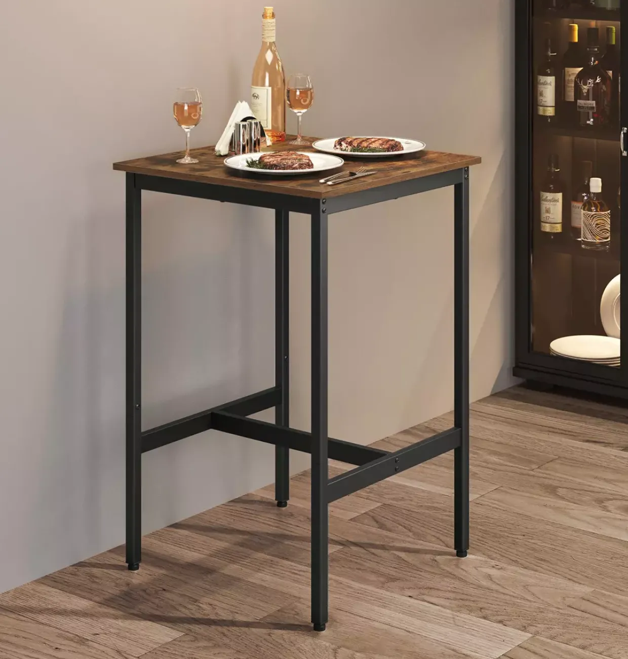 Metall und Holzwerkstoff bieten eine langlebige Basis, die sowohl funktional als auch visuell ansprechend ist. Diese Materialien ergänzen sich ideal und sorgen für Stabilität sowie eine moderne Optik. Die sorgfältige Verarbeitung lässt den Bartisch zu einem langlebigen Begleiter in Ihrem Wohn- oder Essbereich werden.