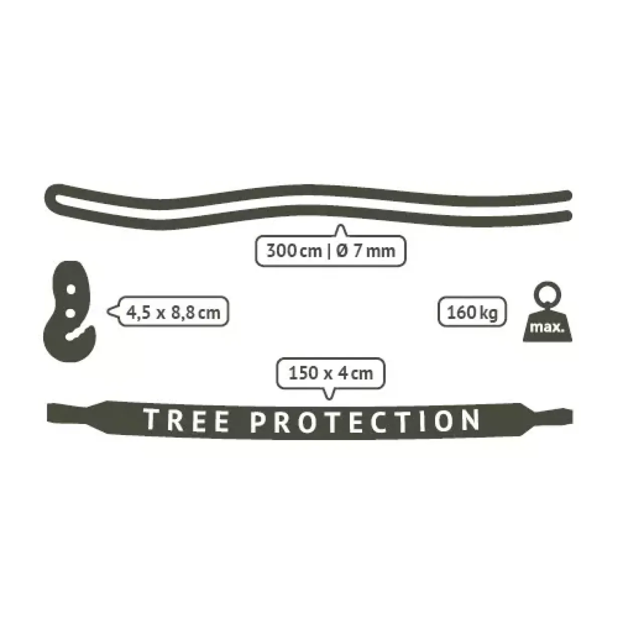 Ein herausragendes Merkmal ist der integrierte Baumschutz. Mit einer Länge von 150 cm und einer Breite von 4 cm sorgt er dafür, dass die Rinde des Baumes unversehrt bleibt und die Natur geschont wird. Diese durchdachte Konstruktion schützt nicht nur die Umgebung, sondern verlängert auch die Lebensdauer der Baumhalterung.