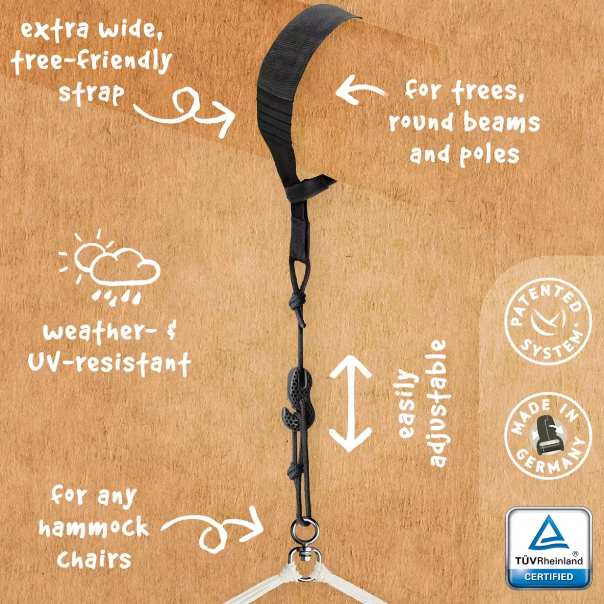 Das Seil, mit einer beeindruckenden Länge von 300 cm und einem Durchmesser von 7 mm, bietet zusätzliche Flexibilität bei der Auswahl der Befestigungspunkte. Dieses Design ermöglicht eine einfache Anpassung an unterschiedliche Baumgrößen und Abstände, was die Installation erleichtert und den Komfort erhöht.