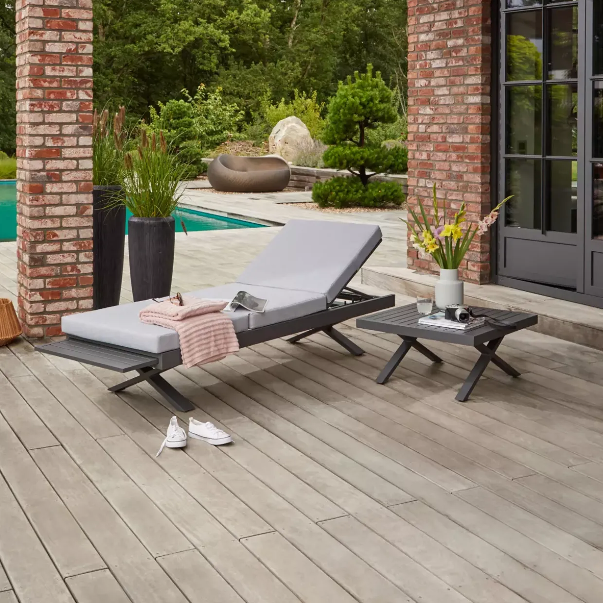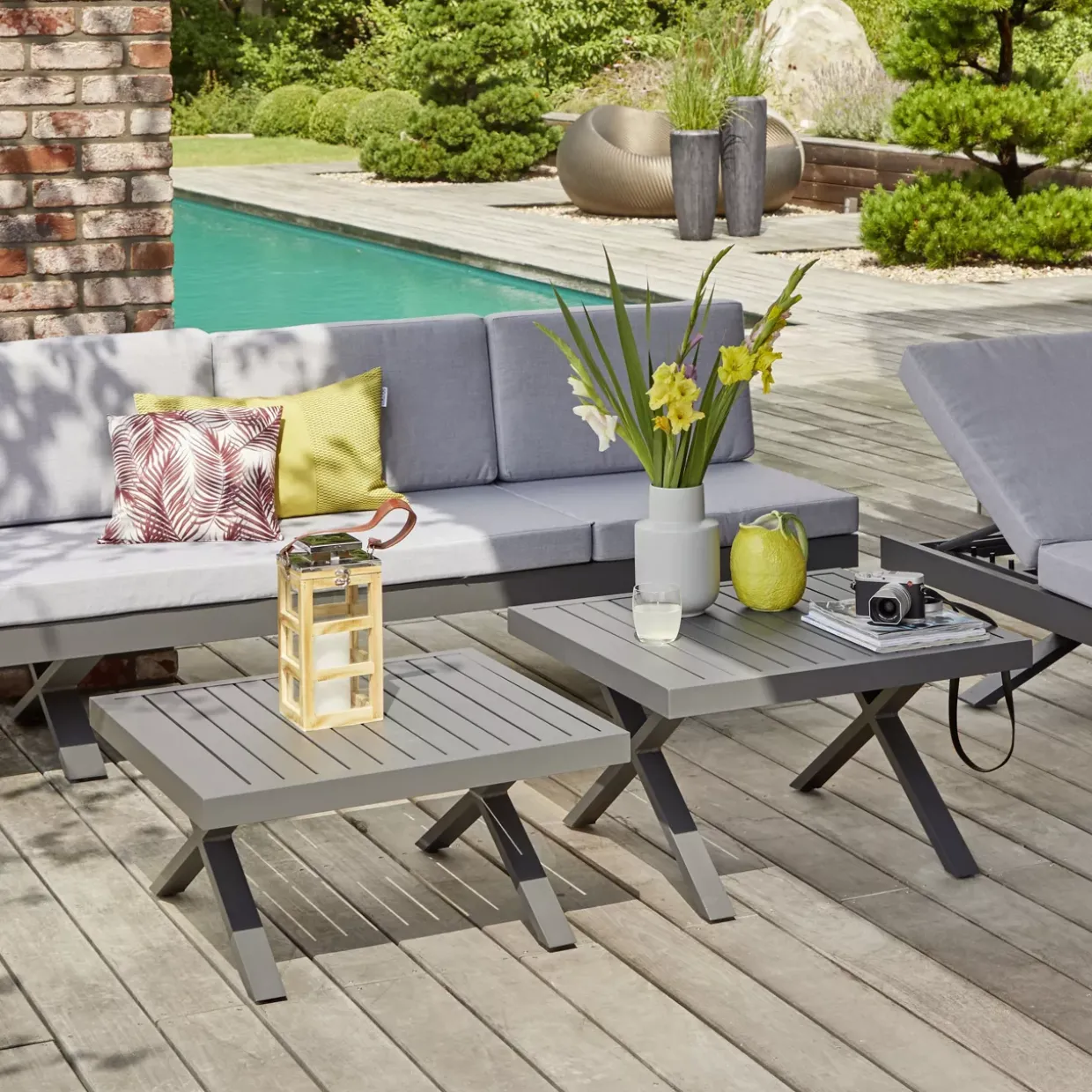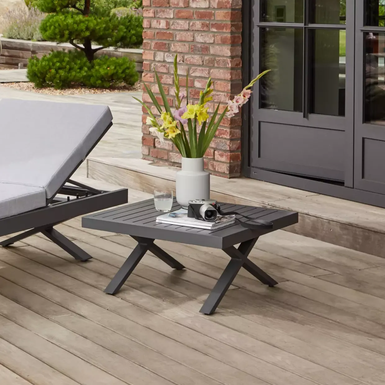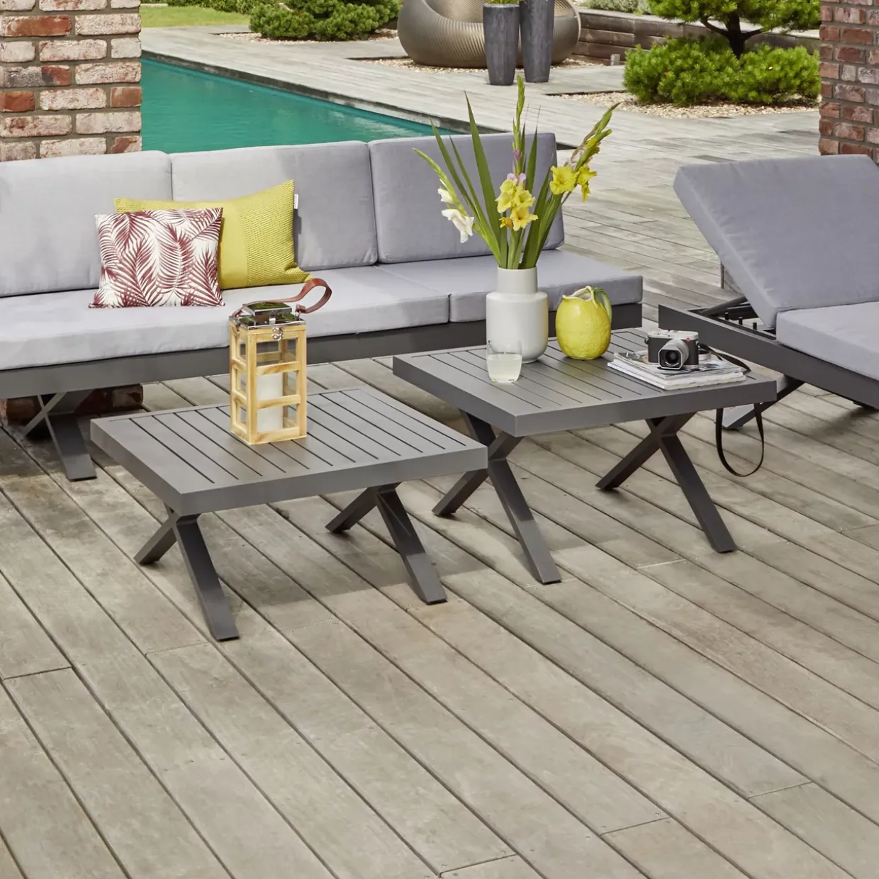 Quadratische Eleganz trifft modernen Stil: Der Beistelltisch Rieke präsentiert sich als perfekter Begleiter für die Sommermonate. Mit seiner ansprechenden X-Fuß-Konstruktion aus hochwertigem Aluminium verleiht er jedem Gartenbereich eine stilvolle und zugleich stabile Basis. Die anthrazitfarbene Oberfläche fügt sich harmonisch in verschiedene Gestaltungskonzepte ein, während das robuste Metallmaterial für Langlebigkeit sorgt.