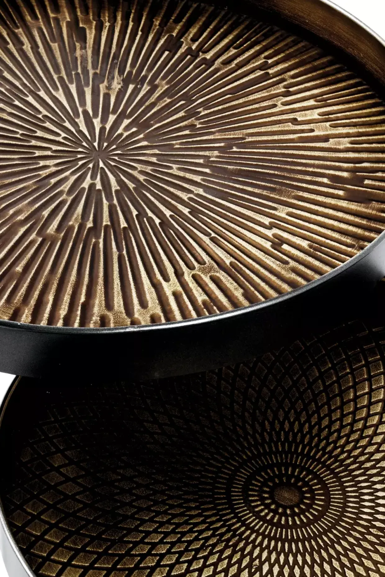Ø ca. 41/51 cm Größe: D. 41/51cm Farbton: Gestell Schwarz / Tischplatte Schwarz-kupfer Zusatzmaße: Höhe ca. 38/48 cm bestehend aus: 1 Beistelltisch-Set. Material: Metall / Tischplatte Metall Stil: Glam Oberfläche: lackiert Form: Tischplatte rund Metallart: Stahl Highlights