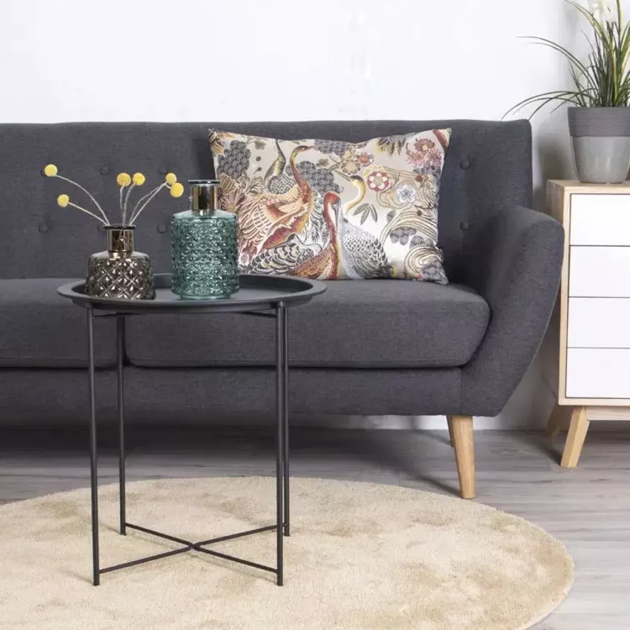 Rund und zeitlos, passt sich dieser Tisch jeder Umgebung an und bietet einen idealen Ort für Ihre Lieblingsdekorationen oder eine Tasse Kaffee. Die Wahl von Metall als Material sorgt nicht nur für Stabilität, sondern auch für eine pflegeleichte Oberfläche, die leicht zu reinigen ist.