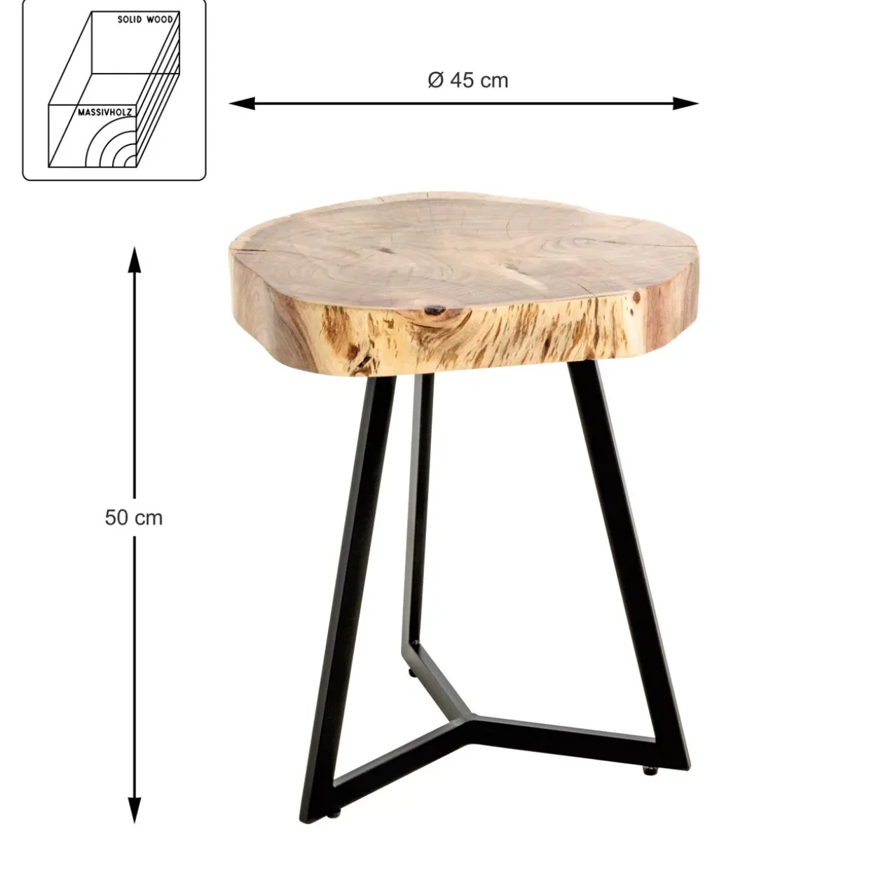 Entdecken Sie den Beistelltisch Patna, der mit seinem natürlichen Stil und der harmonischen Kombination aus Holz und Metall überzeugt. Die elegante Akazienholzoberfläche verleiht jedem Raum eine warme und einladende Atmosphäre, während die schwarze Farbgebung moderne Akzente setzt. Dieser Beistelltisch ist mehr als nur ein funktionales Möbelstück – er ist ein stilvolles Highlight in Ihrem Zuhause, das sich nahtlos in unterschiedlichste Einrichtungsstile integrieren lässt. Die runde Form mit einem Durchmesser von 45 cm bietet ausreichend Platz für Ihre Lieblingsdekorationen oder alltäglichen Gegenstände.