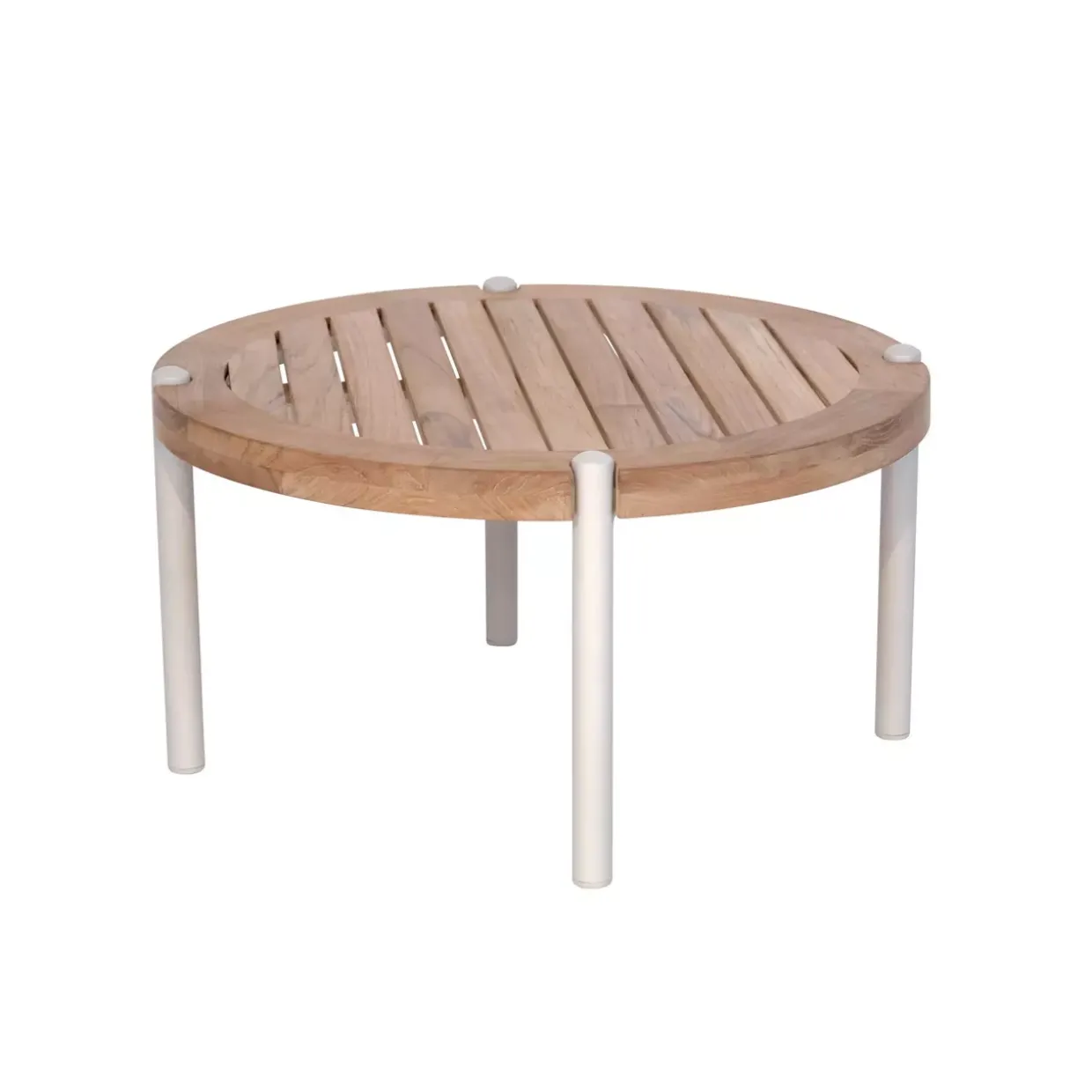 Ein Blickfang für jedes Wohnzimmer oder den Außenbereich, bietet er mit seinem Durchmesser von 65 cm und einer Höhe von 35 cm ausreichend Platz für Ihre Lieblingsbücher, eine Tasse Tee oder dekorative Accessoires. Der hochwertige Materialmix aus Aluminium und Teakholz sorgt für Langlebigkeit und Widerstandsfähigkeit, ideal für den Einsatz im Freien.