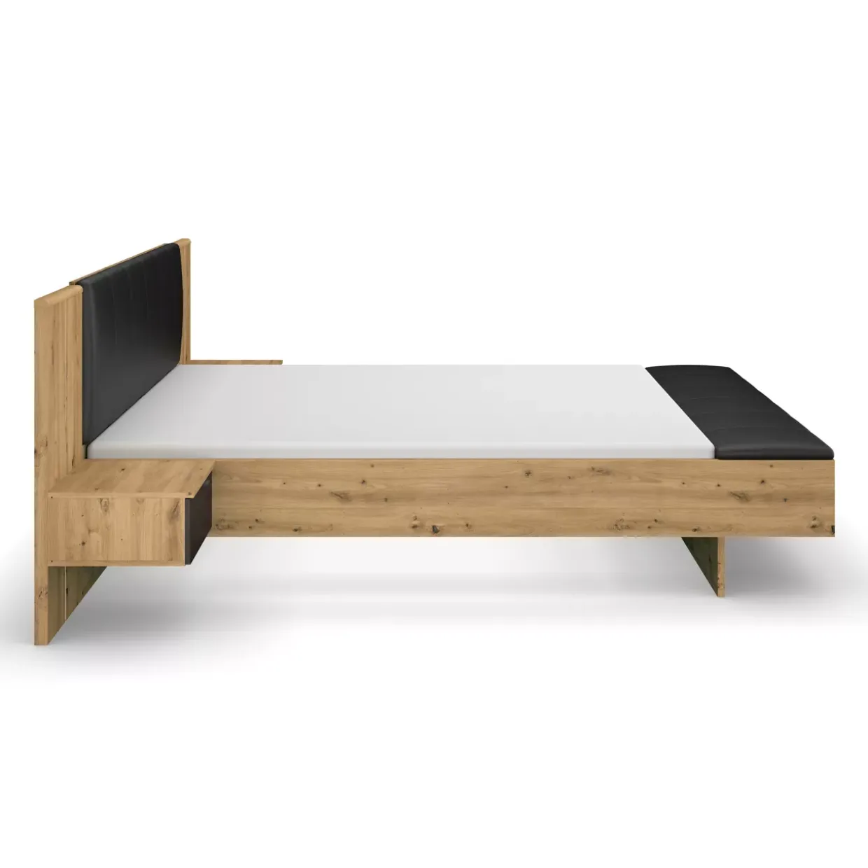 Dekor-Druck Eiche Artisan, ergänzt durch Akzente in Eiche schwarz, schafft eine harmonische Verbindung zwischen Natur und Moderne. Graue metallic Details fügen eine subtile, industrielle Note hinzu, die den modernen Stil der Bettanlage unterstreicht. Die senkrechte LED-Beleuchtung ist nicht nur ein optischer Blickfang, sondern auch praktisch und sorgt für eine angenehme Atmosphäre im Schlafzimmer.