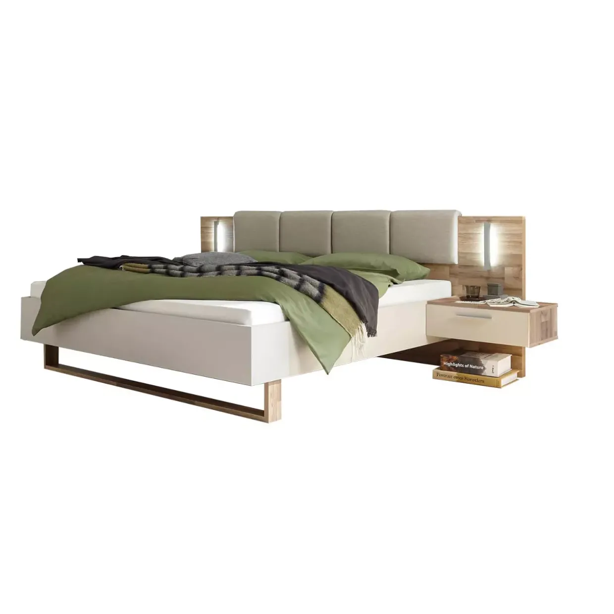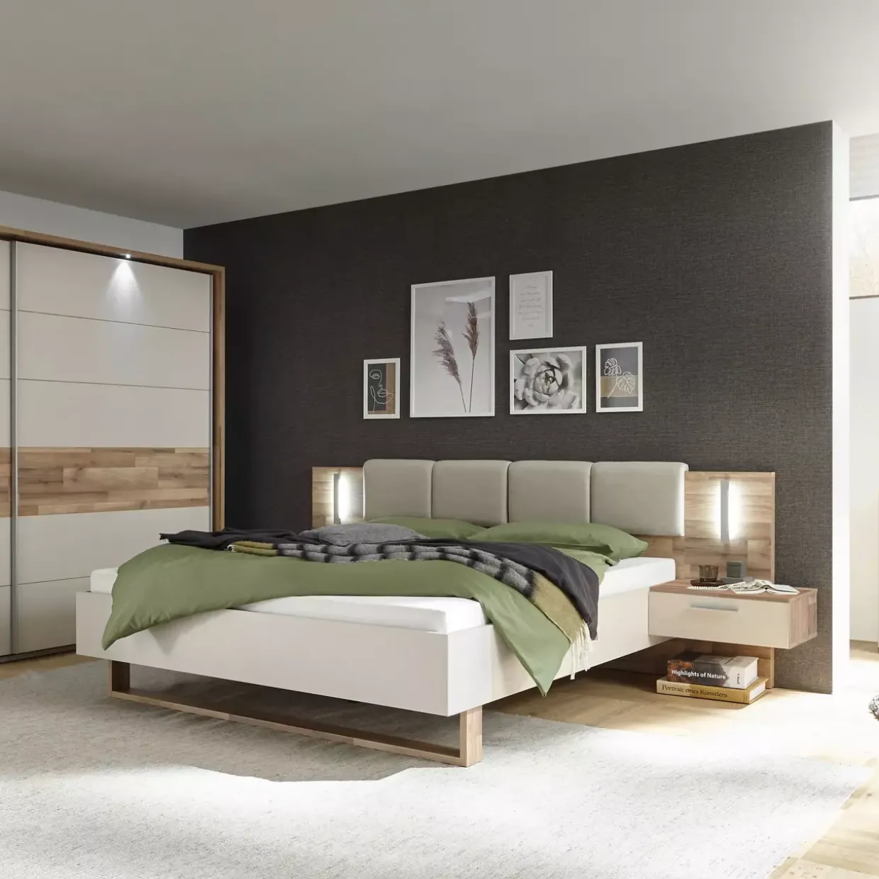 Cadore – ein Name, der für moderne Eleganz steht. Diese Bettanlage vereint zeitgenössisches Design mit funktionalem Nutzen in einer erfrischenden Farbgebung. Die Kombination aus Montana Oak Nachbildung und champagnerfarbenem Holzwerkstoff verleiht dem Raum eine warme und einladende Atmosphäre.