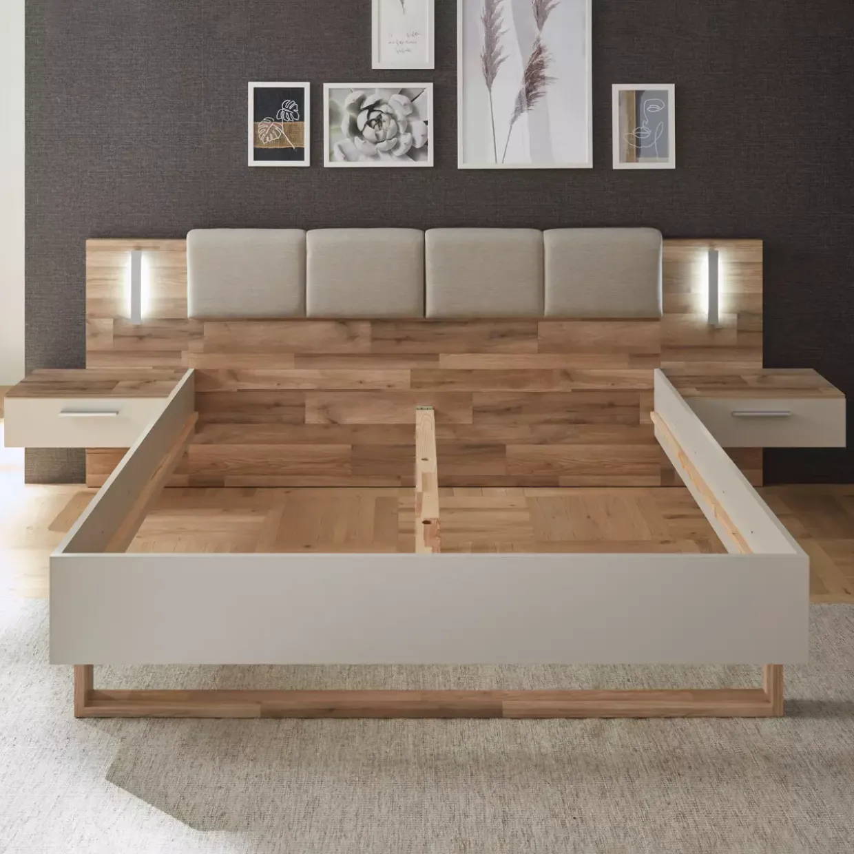 Die Materialwahl ist durchdacht: Holzwerkstoff sorgt für Langlebigkeit, während Stoffelemente eine besondere Behaglichkeit bieten. Diese Bettanlage ist mehr als nur ein Schlafplatz; sie ist ein Ort der Ruhe und Ästhetik.