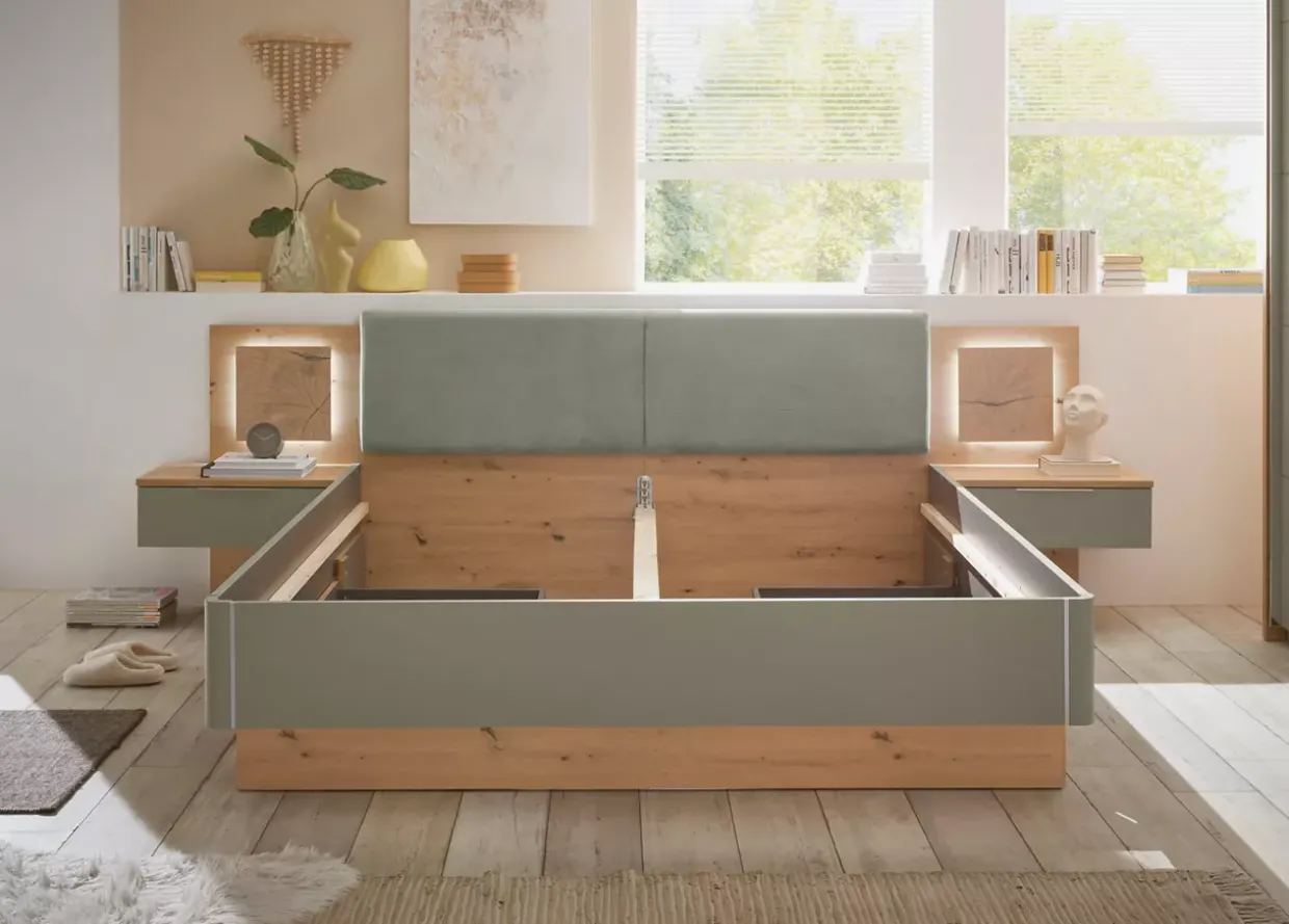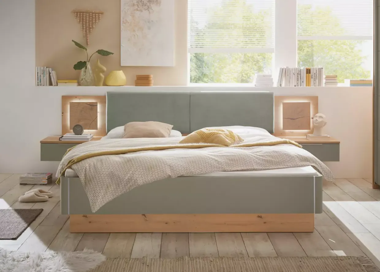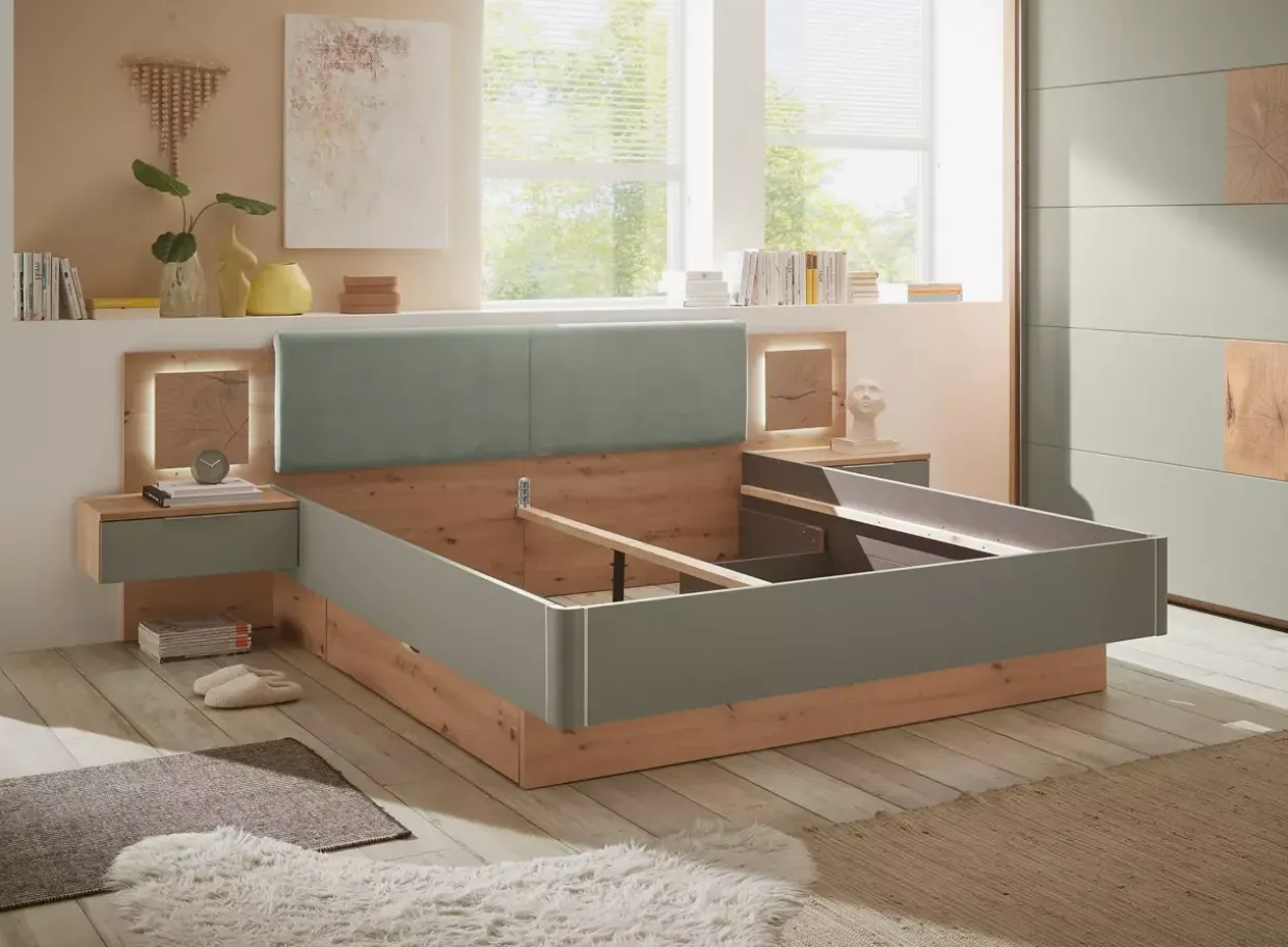 Artisan Eiche trifft auf zeitlosen Stil und schafft eine warme, einladende Atmosphäre in Ihrem Schlafzimmer. Die Simada LIV’IN Bettanlage besticht durch ihr harmonisches Design, das die natürliche Schönheit des Holzwerkstoffes hervorhebt. In Kombination mit der sanften Farbe Salbei entsteht ein Gefühl der Ruhe und Geborgenheit.