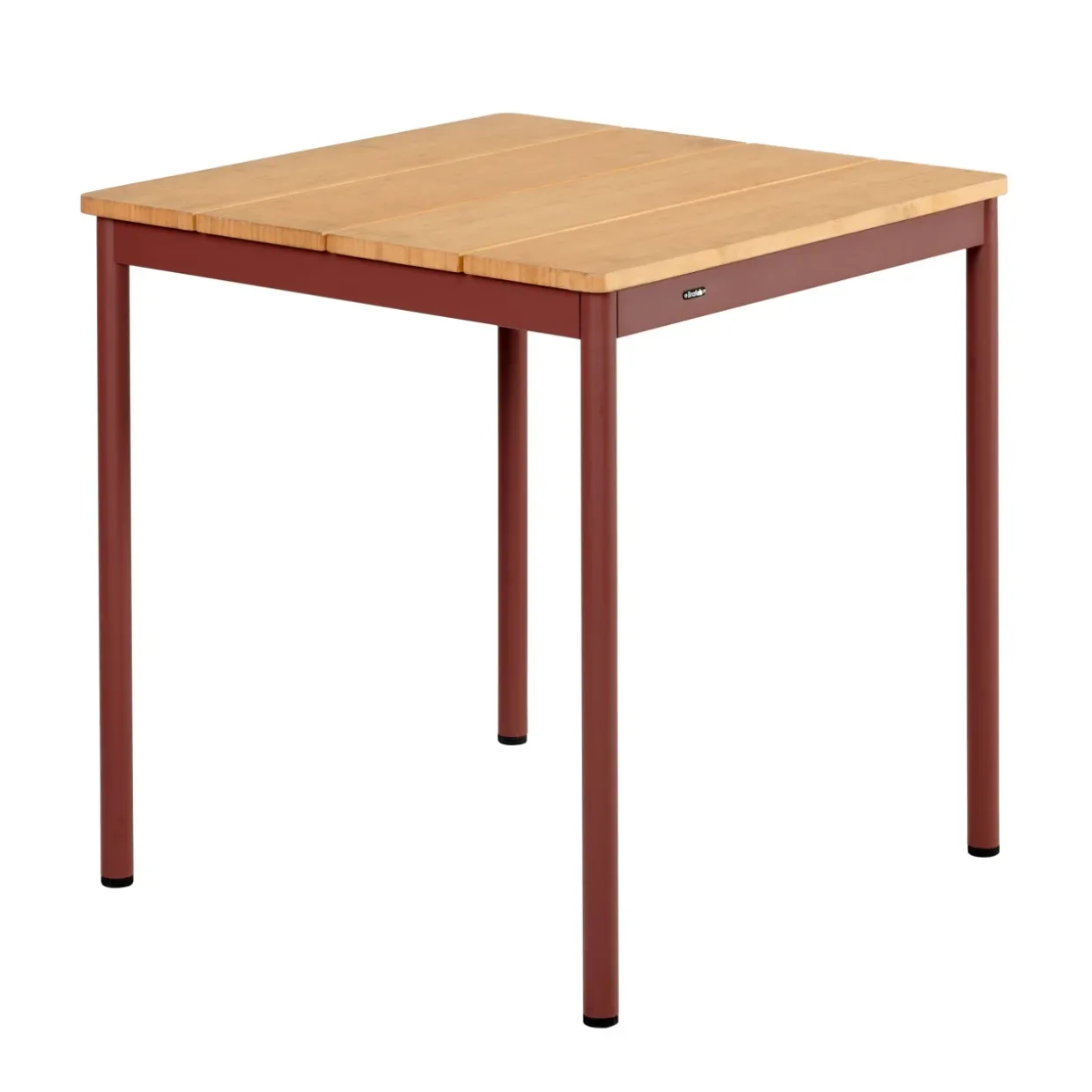 Die Maße von 70×70 cm bieten eine ideale Größe für unterschiedliche Raumkonzepte, sei es in einem gemütlichen Bistro oder einem einladenden Essbereich zu Hause. Die Kombination aus Zin Red und Bamboo bringt eine warme, einladende Atmosphäre in jeden Raum, während die metallische Struktur für Stabilität sorgt.