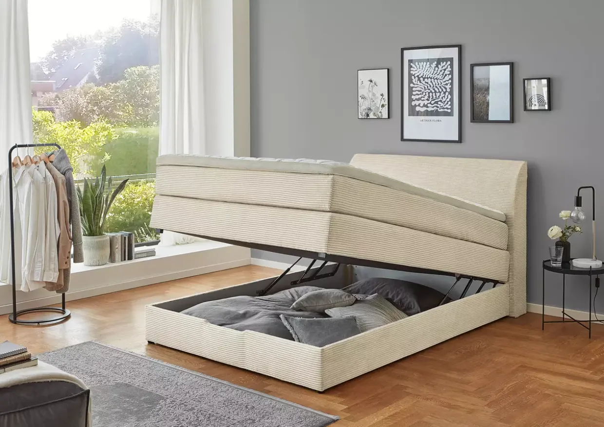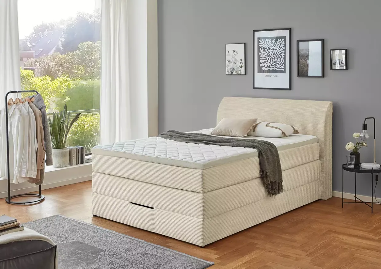 Ein abgerundetes Kopfteil mit Ziernähten verleiht diesem Boxspringbett eine elegante Note. Die Kombination aus Cord-Gewebe und Polyester sorgt für eine angenehme Haptik und eine moderne Optik. Durchdachte Funktionalität zeigt sich im integrierten Bettkasten, dessen Deckel dank Gasdruckfeder mühelos von vorne zu öffnen ist. Ventilationsöffnungen im Boden gewährleisten eine optimale Belüftung.