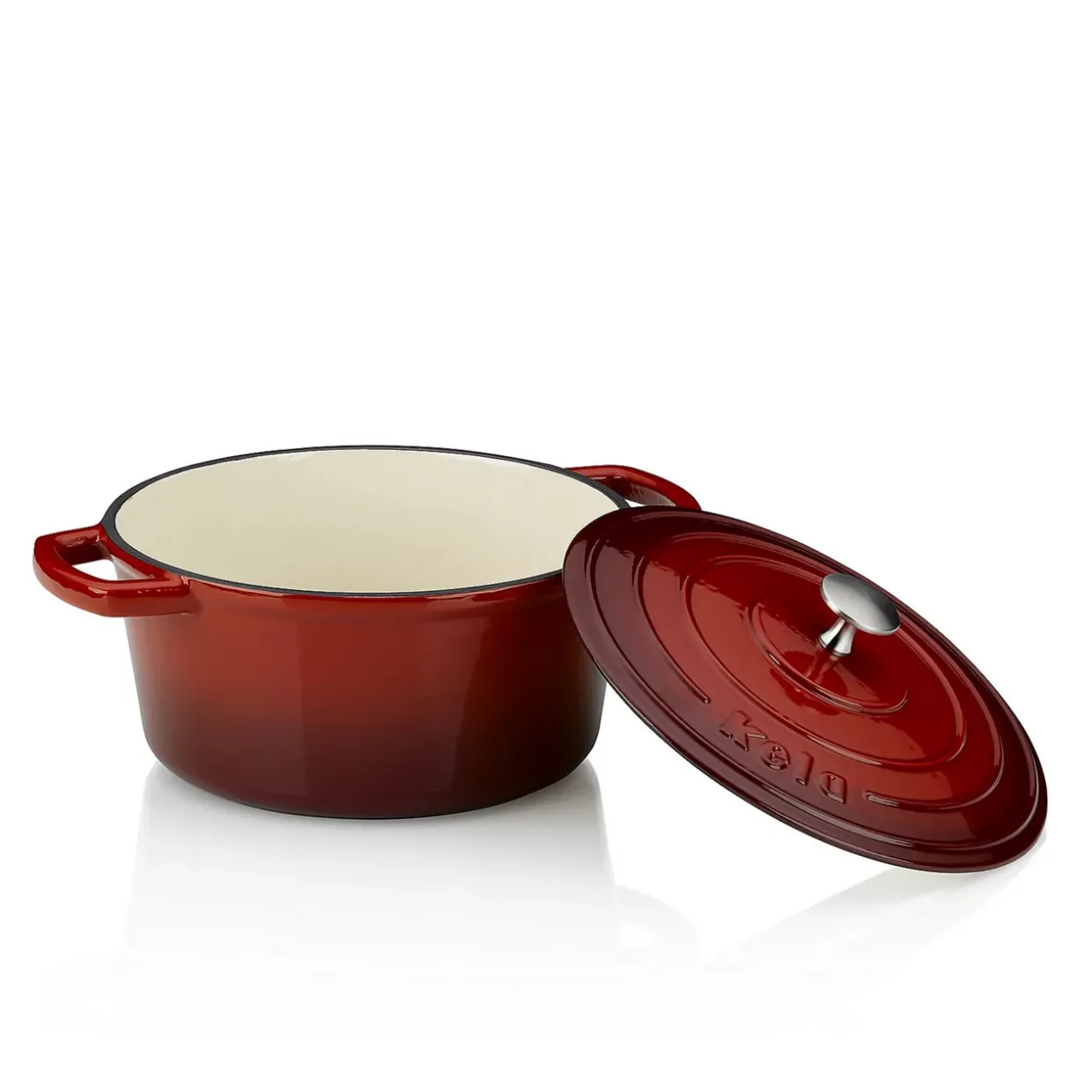 Ein glänzender Auftritt in der Küche: Der rote, emaillierte Bräter überzeugt nicht nur durch seine stilvolle Cottage-Optik, sondern auch durch seine hohe Funktionalität. Gefertigt aus robustem Gusseisen, verspricht dieses Kochgeschirr aus der kela-Serie Calido eine lange Lebensdauer und eine gleichmäßige Wärmeverteilung. Mit einem Durchmesser von 24 cm und einem Fassungsvermögen von 3,8 Litern bietet er ausreichend Platz für saftige Schmorgerichte, die im eigenen Saft perfekt garen.