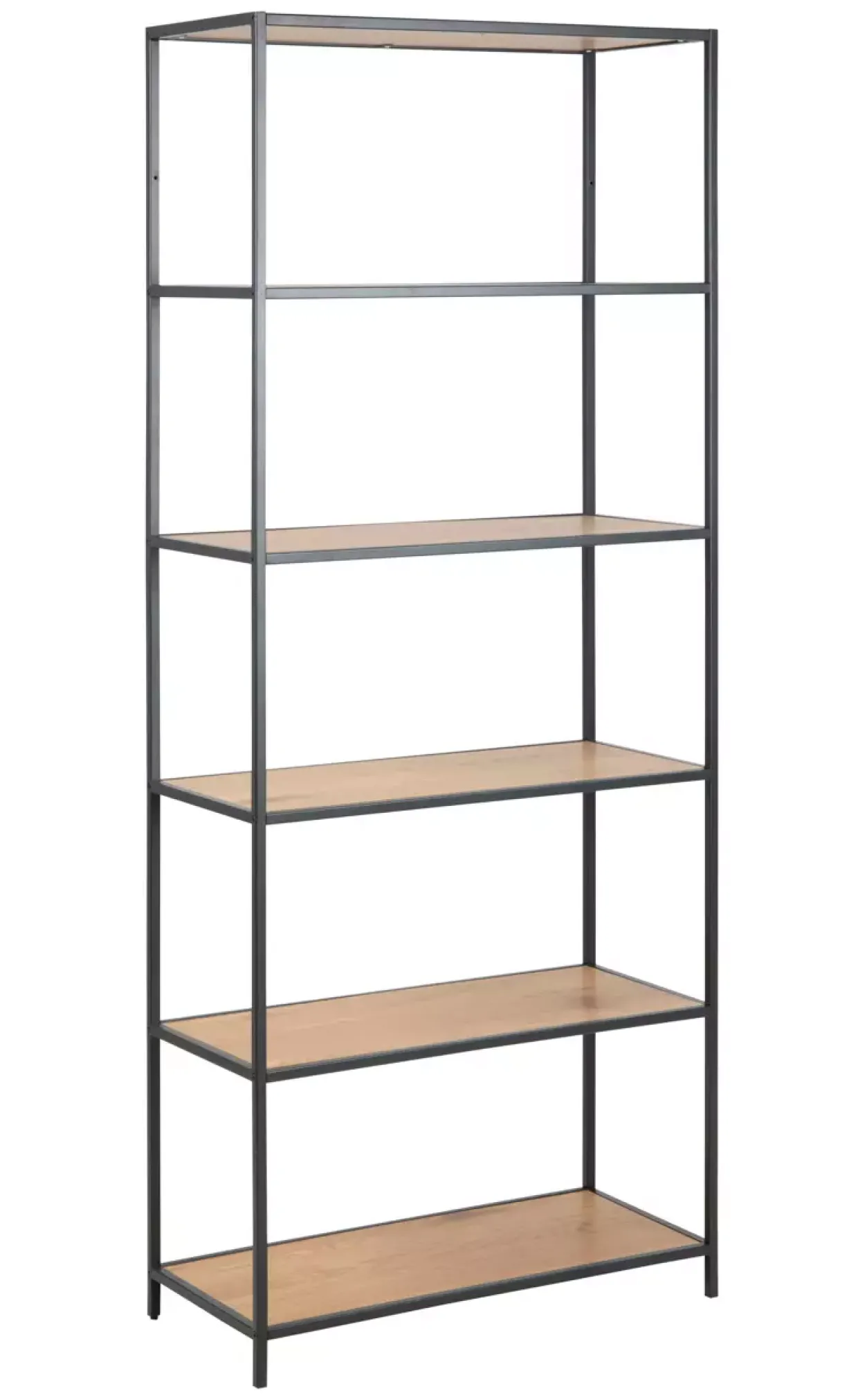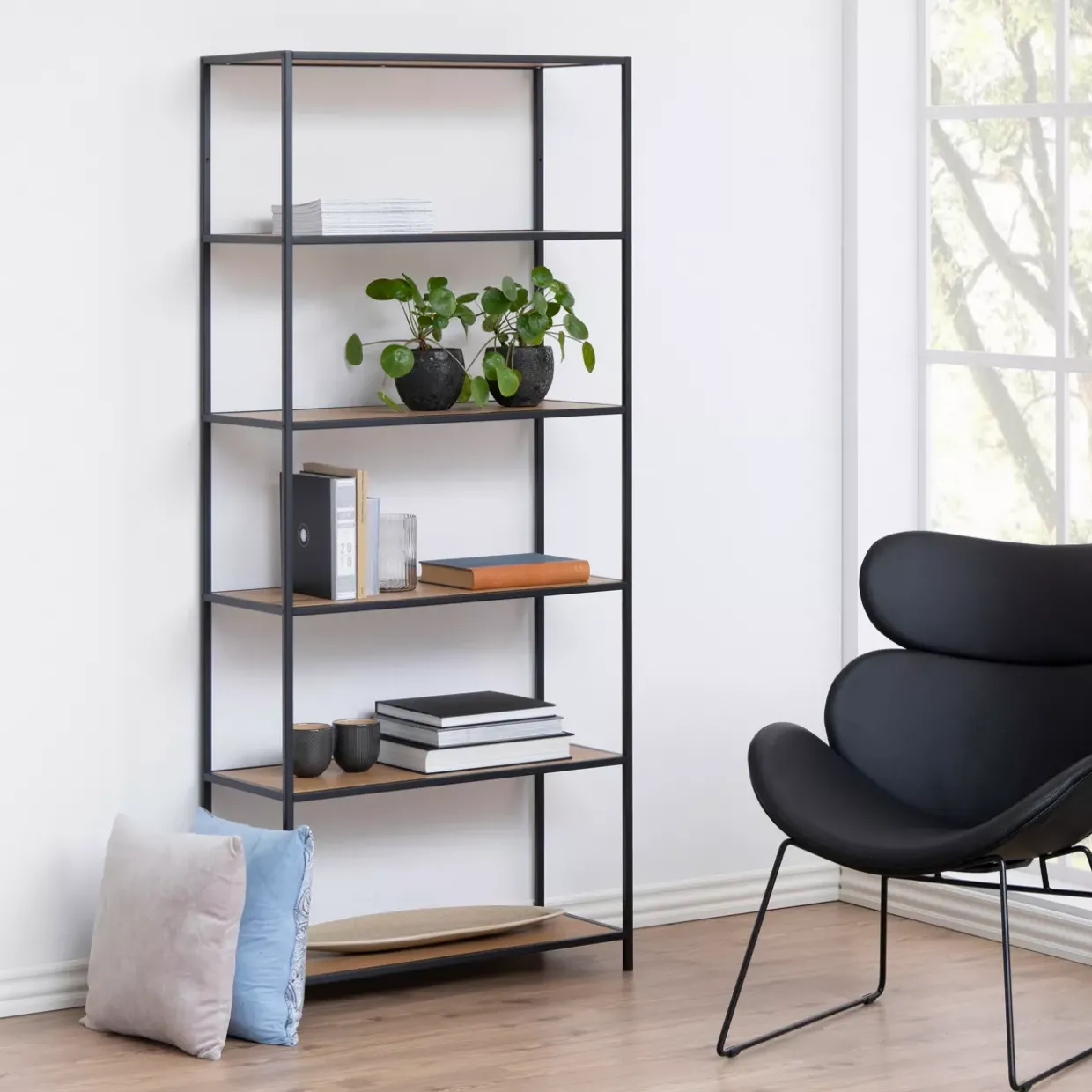Das Seaford Bücherregal besteht aus einer harmonischen Mischung von Materialien, die sowohl Ästhetik als auch Langlebigkeit gewährleisten. Der Einsatz von stabilem Stahlmetall sorgt nicht nur für eine starke Struktur, sondern unterstreicht auch den industriellen Charakter des Möbels. Die Regalböden aus Wildeiche-Nachbildung bieten viel Platz für Ihre Bücher, Dekorationen oder andere persönliche Schätze. Diese Materialkombination schafft ein Möbelstück, das sowohl funktional als auch stilvoll ist, ideal für all diejenigen, die Wert auf ein modernes Wohnambiente legen.