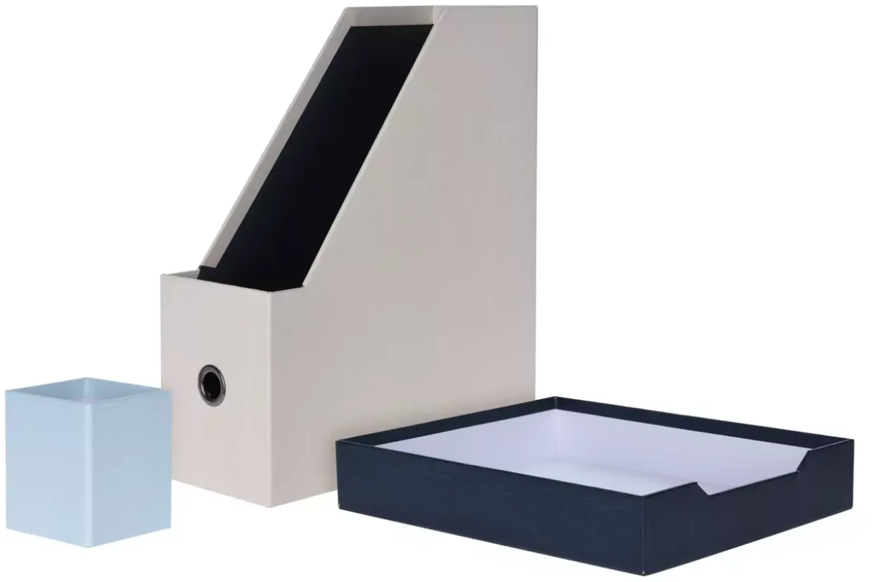 Hellgrau, hellblau und schwarz – diese ansprechende Farbpalette verleiht dem modernen Büroorganizer eine stilvolle Note. Ein harmonisches Zusammenspiel von Farben und Funktionalität, das in jedem Arbeitsumfeld für Ordnung und Übersicht sorgt. Hergestellt aus hochwertigem Papier, bietet der Organizer eine nachhaltige und dennoch elegante Lösung für Ihre Bürobedürfnisse.