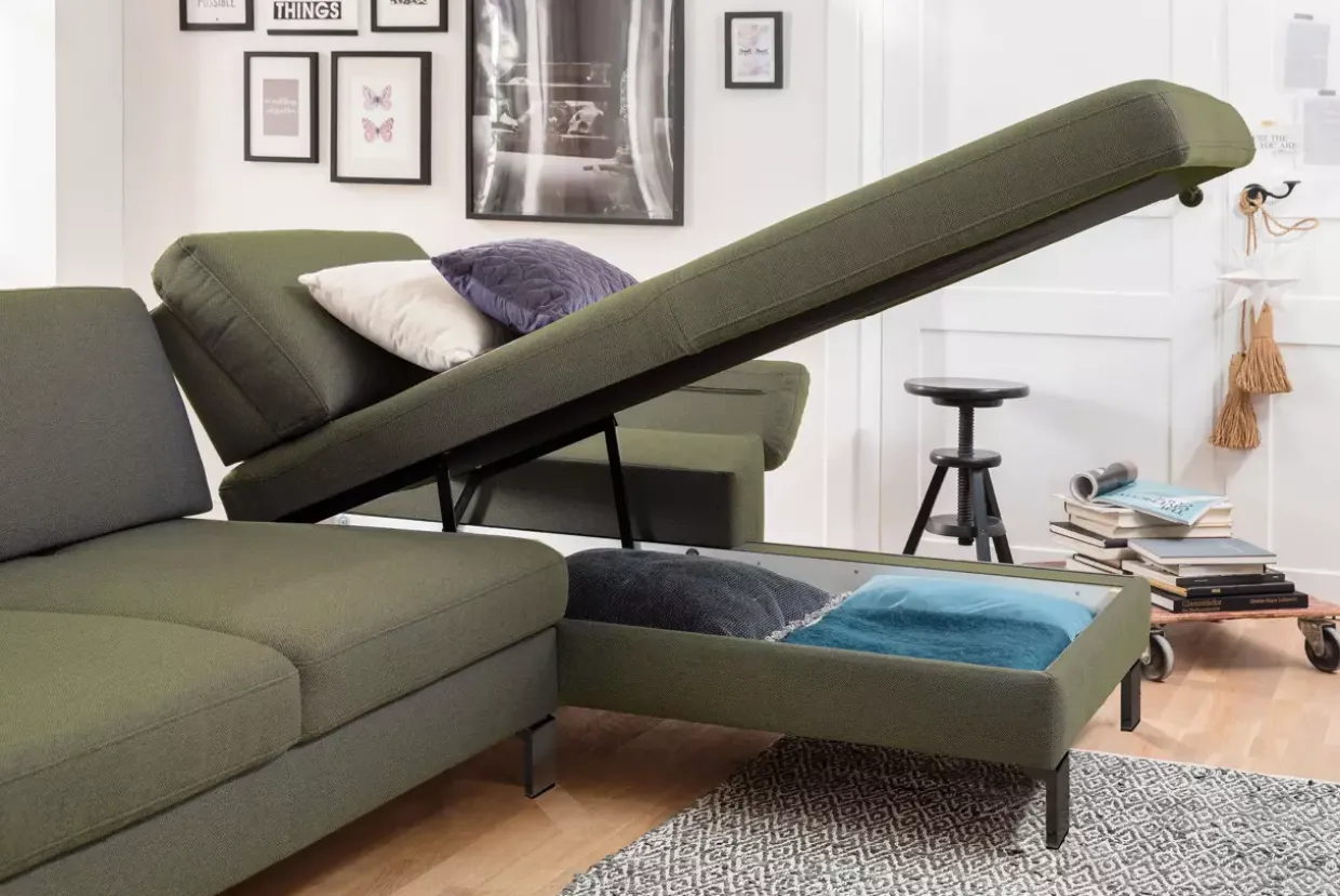 Ein weiteres Highlight ist die verstellbare Rückentiefenverstellung, die maßgeschneiderten Komfort ermöglicht. Die Longchair Armlehne lässt sich flexibel klappen, während der Stauraum unter dem Longchair hochklappbar ist, um zusätzlichen Platz zu schaffen. So wird die Organisation des Wohnraums spielend leicht.