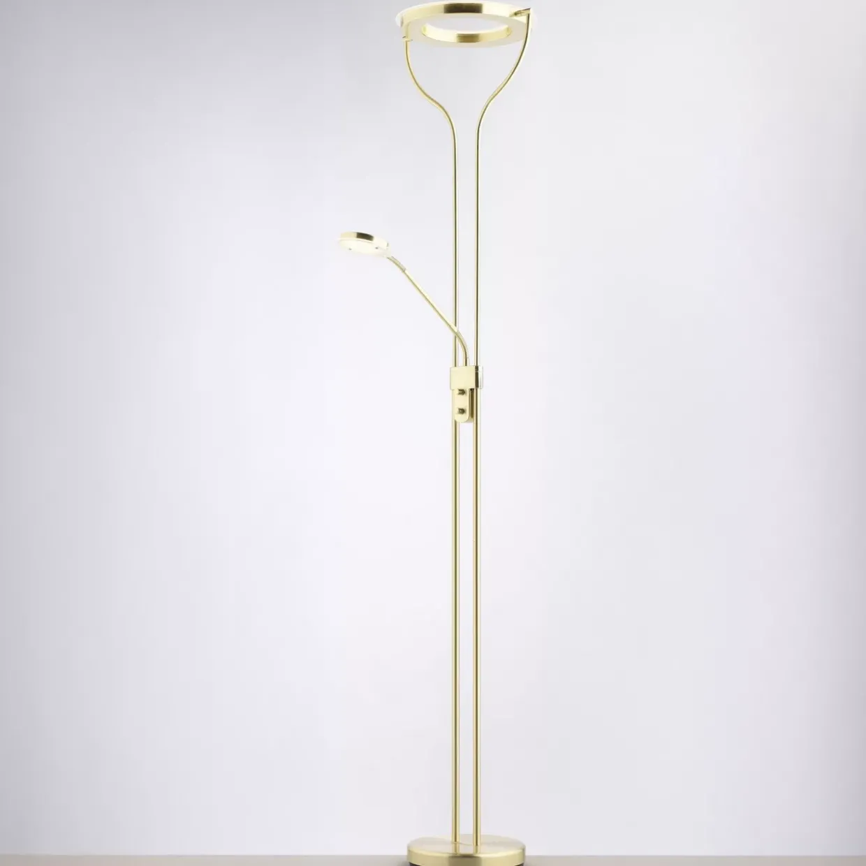 Der Deckenfluter ist nicht nur ein Hingucker, sondern auch äußerst praktisch. Dank des integrierten Dimmers und des separaten Lesearms können Sie die Lichtintensität individuell an Ihre Bedürfnisse anpassen. Beide Lichtquellen lassen sich getrennt schalten, was zusätzliche Flexibilität bietet. Ein gemütliches Leseambiente oder eine helle Raumbeleuchtung – Sie haben die Wahl.