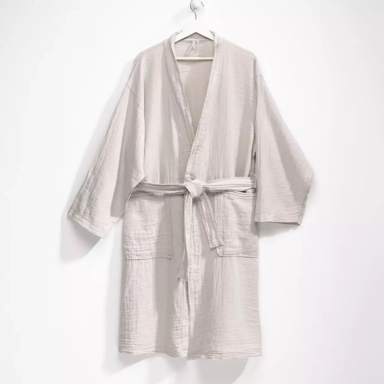 In der zarten Gewebeart des Musselins entfaltet sich der Charme dieses Bademantels, der durch seine moderne Stilrichtung besticht. Greige, eine subtile und vielseitige Farbe, verleiht dem Kleidungsstück eine elegante Note und passt sich nahtlos an jede Umgebung an. Das Modell Musselin ist nicht nur ein modischer Begleiter, sondern auch ein praktischer: Dank seiner leichten Textur und der Verwendung von Naturfasern bietet es das ganze Jahr über angenehmen Tragekomfort.
