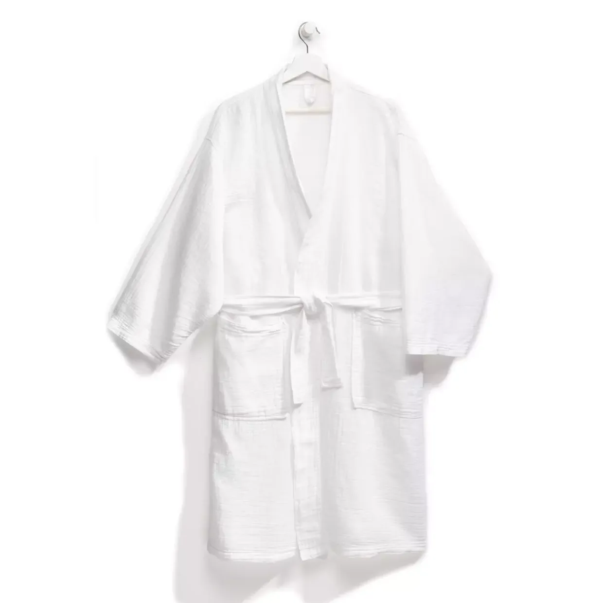 S/M weiß ; 2 lagig; mit Seitentaschen und Bindegürtel;Musselin, ein Gewebe voller Leichtigkeit und Eleganz, verleiht diesem Bademantel seine moderne Note. Das sanfte, natürliche Material aus Textil umhüllt Sie das ganze Jahr über mit einem Hauch von Luxus. Die strahlend weiße Farbe passt sich mühelos jeder Umgebung an und unterstreicht die zeitlose Schönheit des modernen Stils.Für alle, die Wert auf Qualität und Nachhaltigkeit legen, bietet das Ökotex Standard 100 Zertifikat Sicherheit und Vertrauen. Dieser Bademantel vereint Komfort und Umweltbewusstsein auf harmonische Weise. Die Pflege gestaltet sich unkompliziert: Maschinenwäsche bis 40°C erhält die Frische, während der Trockner bei niedriger Temperatur für angenehme Weichheit sorgt. Auf das Bügeln und chemische Reinigungen kann verzichtet werden, was den Alltag erleichtert.Der leichte Musselin Bademantel ist nicht nur ein funktionaler Begleiter, sondern auch ein stilvolles Accessoire, das in keiner Garderobe fehlen sollte. Die Beschaffenheit aus Naturfaser sorgt für ein angenehmes Tragegefühl, das Ihre Haut atmen lässt. Dank der ganzjährigen Eignung ist er zu jeder Jahreszeit ein verlässlicher Partner für entspannte Stunden zu Hause. Entdecken Sie die Verbindung aus Ästhetik und Praktikabilität und lassen Sie sich von der zeitlosen Eleganz des Musselin-Stils inspirieren.