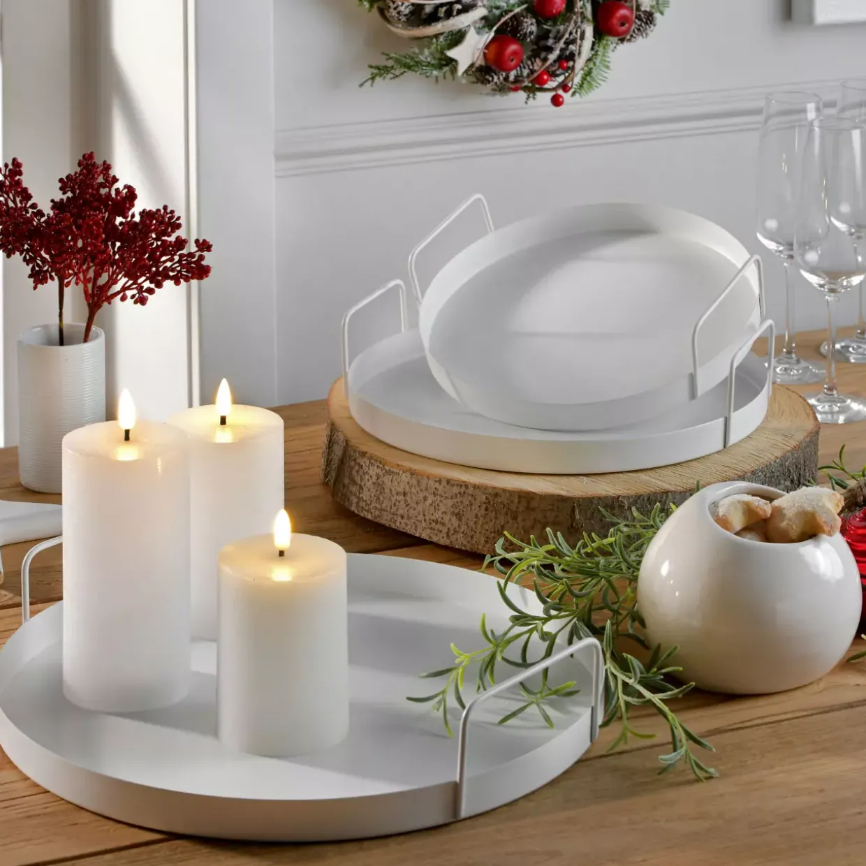 Ein edles Deko-Tablett in strahlend weißem Metall setzt in jedem Raum einen modernen Akzent. Das Set aus drei identischen Tabletts überzeugt nicht nur durch seine klare Linienführung, sondern auch durch seine Vielseitigkeit in der Anwendung. Mit einem großzügigen Durchmesser von 35 cm bietet jedes Tablett ausreichend Platz, um dekorative Arrangements stilvoll in Szene zu setzen.