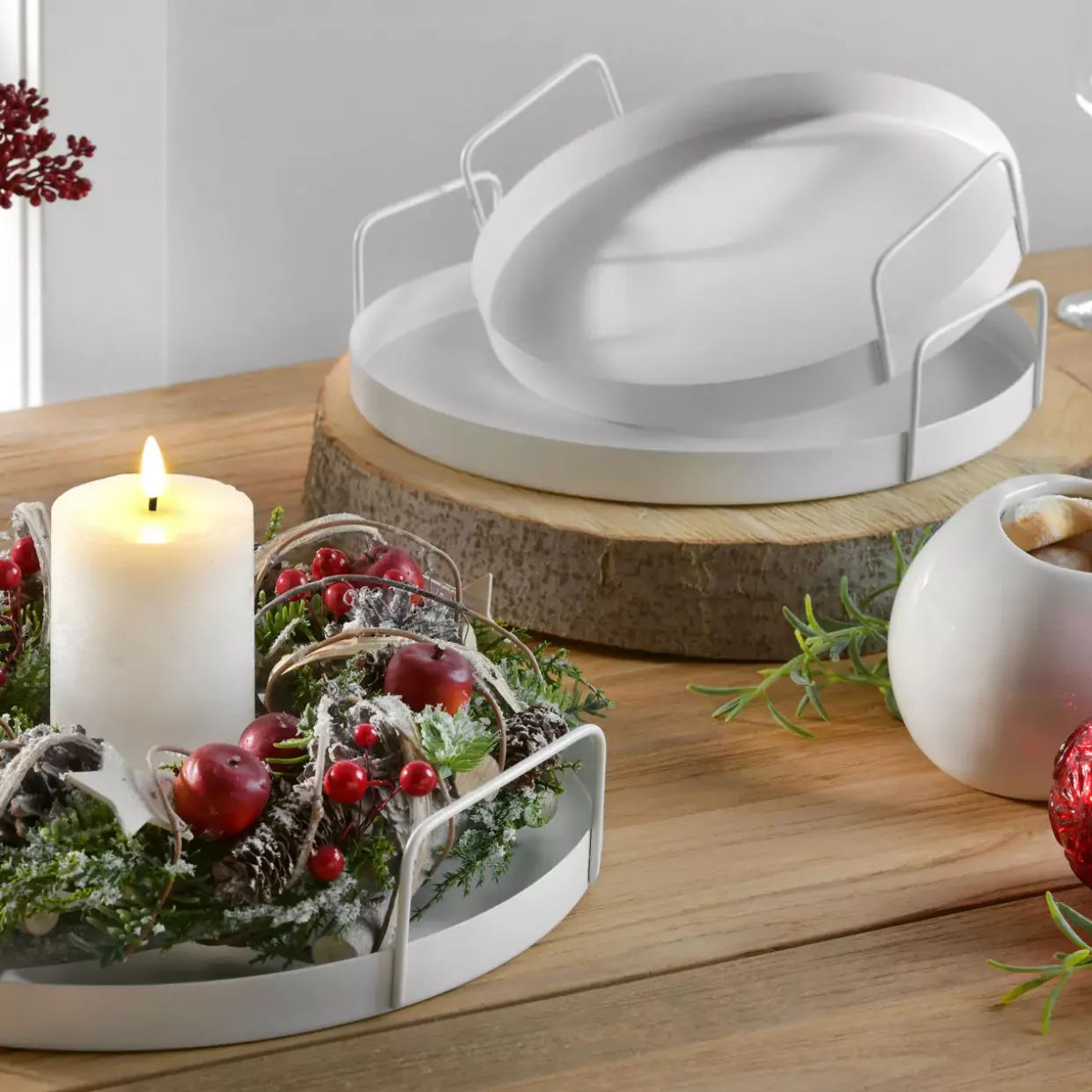 Das Deko-Tablett aus weißem Metall mit einem Durchmesser von 35 cm ist ein charmantes und vielseitiges Dekorationselement, das Ihrem Zuhause einen modernen und eleganten Akzent verleiht. Mit seinem kompakten, minimalistischen Design passt dieses Tablett perfekt in unterschiedlichste Wohnstile, von skandinavisch bis zeitlos klassisch. Hergestellt aus robustem Metall, zeichnet sich das Tablett durch seine langlebige Qualität und seine glatte, weiße Oberfläche aus, die eine sanfte, matte Optik bietet. Die neutrale Farbgebung ermöglicht eine harmonische Integration in jede Einrichtung und bietet eine flexible Basis für verschiedenste Dekorationsideen. Das 25 cm große Tablett ist ideal für kleinere Arrangements und eignet sich perfekt, um Kerzen, Vasen, Schmuck oder andere dekorative Gegenstände stilvoll in Szene zu setzen. Ob auf einem Beistelltisch, einer Kommode oder als Teil eines festlichen Tisches – dieses Tablett bringt Ihre Lieblingsstücke zur Geltung und verleiht dem Raum eine ordentliche und geschmackvolle Note.