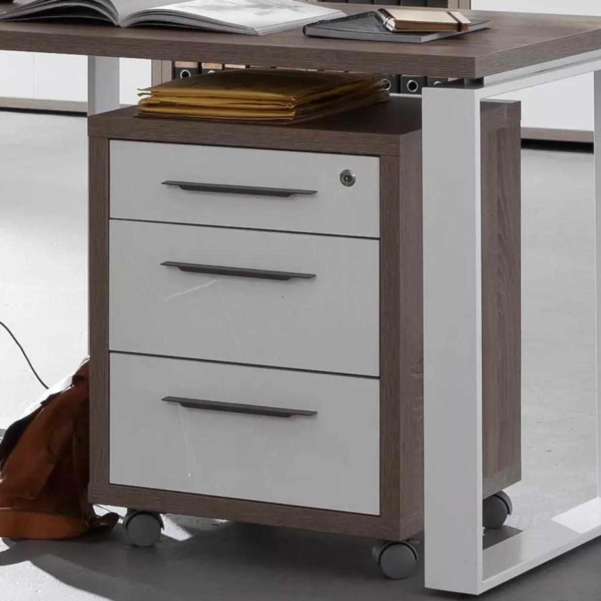 Auf Rollen bewegt sich der Disegno Rollcontainer mühelos durch Ihren Raum und bietet dabei eine flexible Lösung für Ihre Büroorganisation. Die Kombination aus weißem Hochglanz und Trüffeleiche Melamin verleiht diesem Möbelstück eine stilvolle und moderne Note, die sich nahtlos in ein Loft-Design einfügt. Mit einer Anzahl von drei Schubladen bietet er ausreichend Platz, um Ihre Dokumente, Büromaterialien oder persönlichen Gegenstände ordentlich zu verstauen.