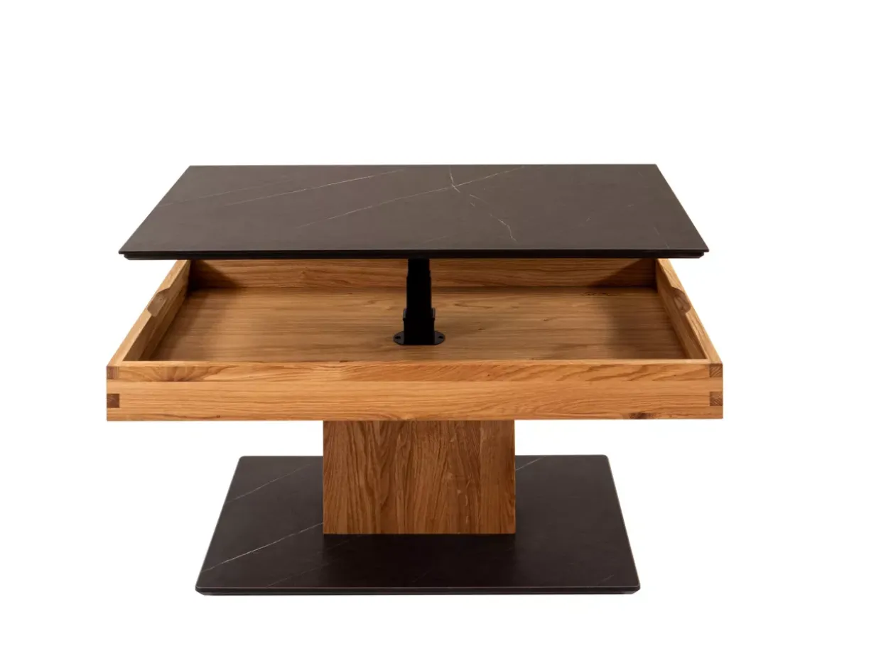 Ein Blickfang in jedem modernen Wohnzimmer: Der rechteckige Couchtisch beeindruckt nicht nur durch seine klaren Linien, sondern auch durch seine exquisite Kombination aus Wildeiche und dem eleganten Marmara Nero. Mit seiner geölten Oberfläche strahlt der Tisch eine natürliche Wärme aus, die einladend wirkt und zugleich eine hochwertige Verarbeitung unterstreicht.