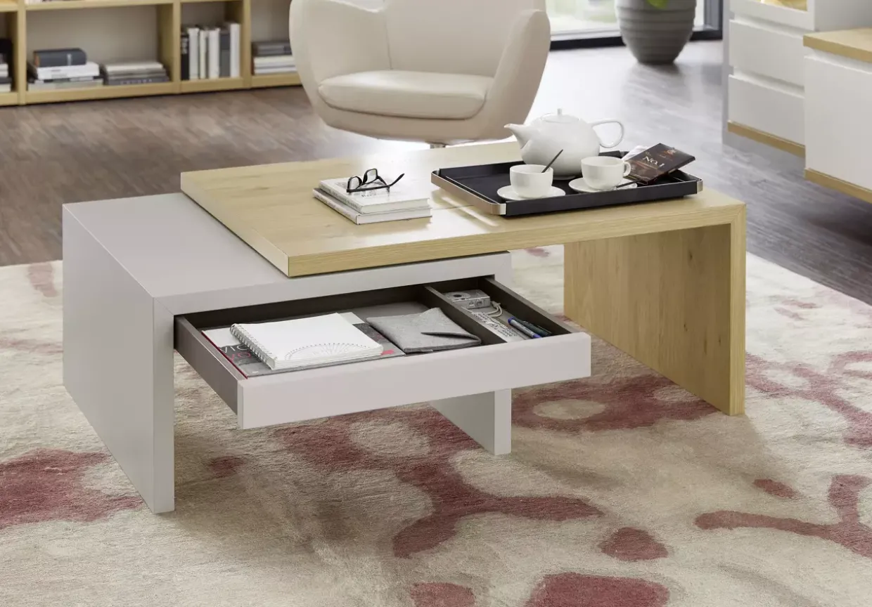 Ein weiteres Highlight ist der integrierte Schubkasten, der zusätzlichen Stauraum bietet. Er eignet sich hervorragend zur Aufbewahrung von Zeitschriften, Fernbedienungen oder anderen kleinen Gegenständen des täglichen Gebrauchs. So bleibt die Tischoberfläche stets aufgeräumt und frei für dekorative Arrangements.