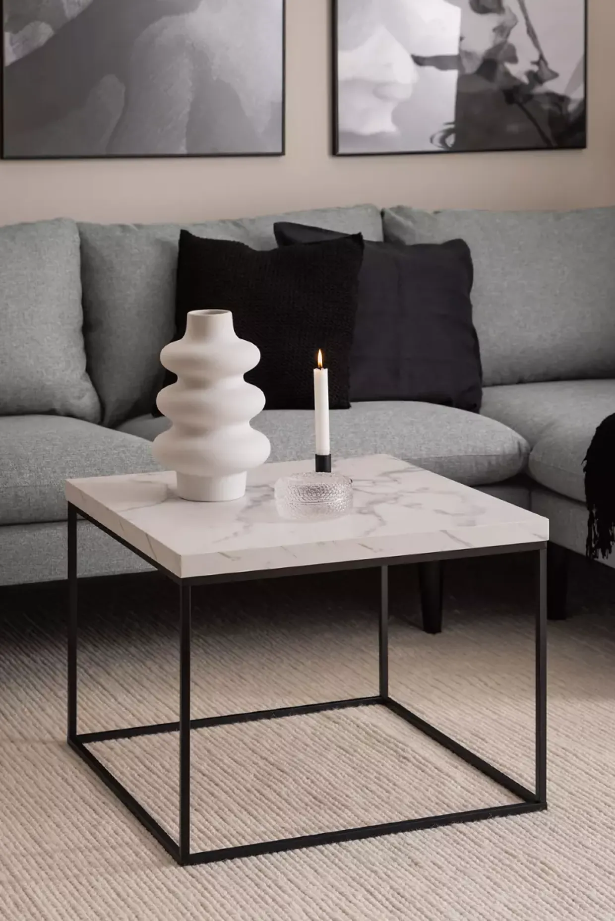 Ein Couchtisch mit einer Platte aus Carrara-Marmor und einem Gestell aus schwarzem, mattem Metall ist ein elegantes und zeitloses Möbelstück, das jedem Wohnraum einen Hauch von Luxus verleiht.