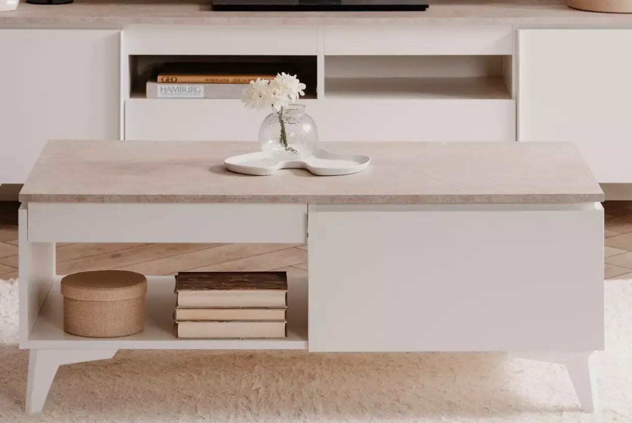 Ein elegantes 4-Fußgestell verleiht dem Tisch Stabilität und fügt sich harmonisch in jedes Wohnzimmer ein. Die Kombination aus Holzwerkstoff und Kunststoff bietet eine robuste Konstruktion, die gleichzeitig optisch ansprechend bleibt. Der Tisch ist in zwei sanften Farbtönen erhältlich, die sich mühelos in verschiedene Einrichtungsstile integrieren lassen.
