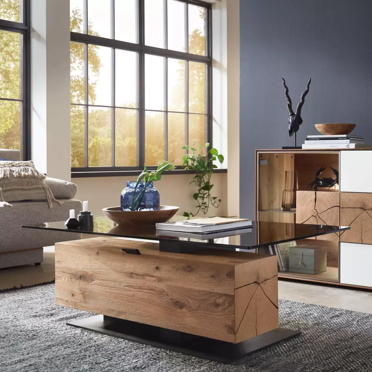 Besonders hervorzuheben ist das Zusammenspiel der Materialien. Die Wärme des Holzes trifft auf die kühle Eleganz des Glases und schafft so ein harmonisches Gleichgewicht. Dieser Couchtisch ist nicht nur ein funktionales Möbelstück, sondern auch ein Statement, das in jedem Raum Akzente setzt.