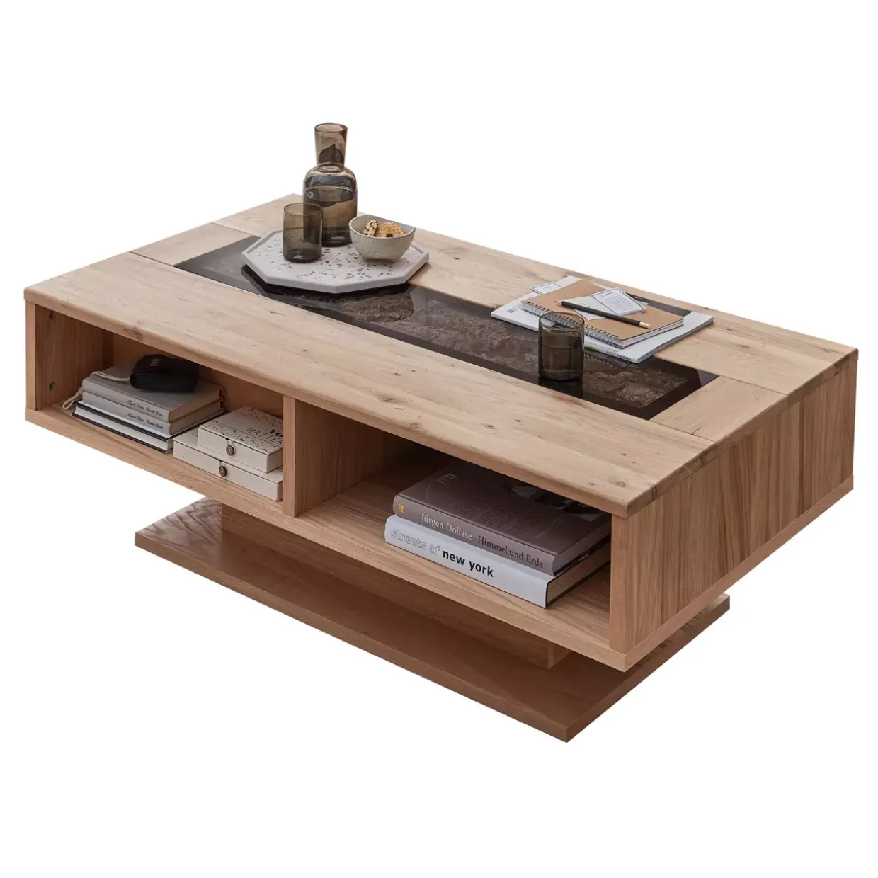 Massivholz sorgt für Stabilität und Langlebigkeit, während das Wildeichefurnier den natürlichen Charme dieses Möbelstücks betont. Durch die Verwendung von hochwertigen Materialien strahlt der Tisch eine warme, einladende Aura aus, die Ihr Wohnzimmer zu einem gemütlichen Rückzugsort macht. Die gerundeten Absetzungen aus Echtkork sind ein weiteres Highlight, das den Tisch zu etwas Besonderem macht und ihm eine moderne Note verleiht.