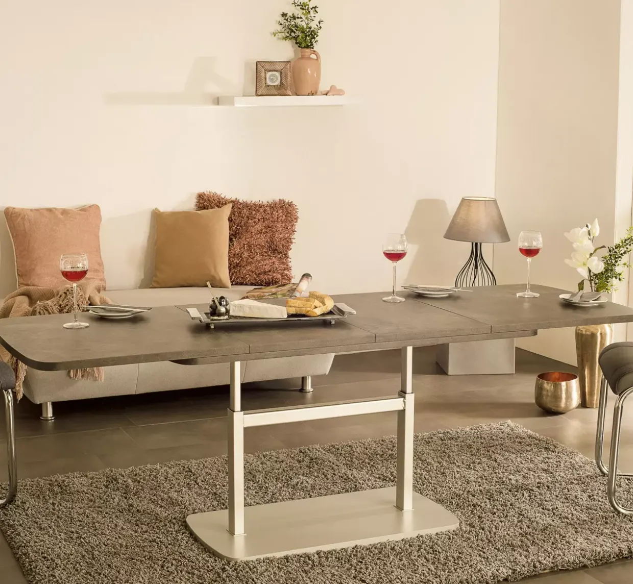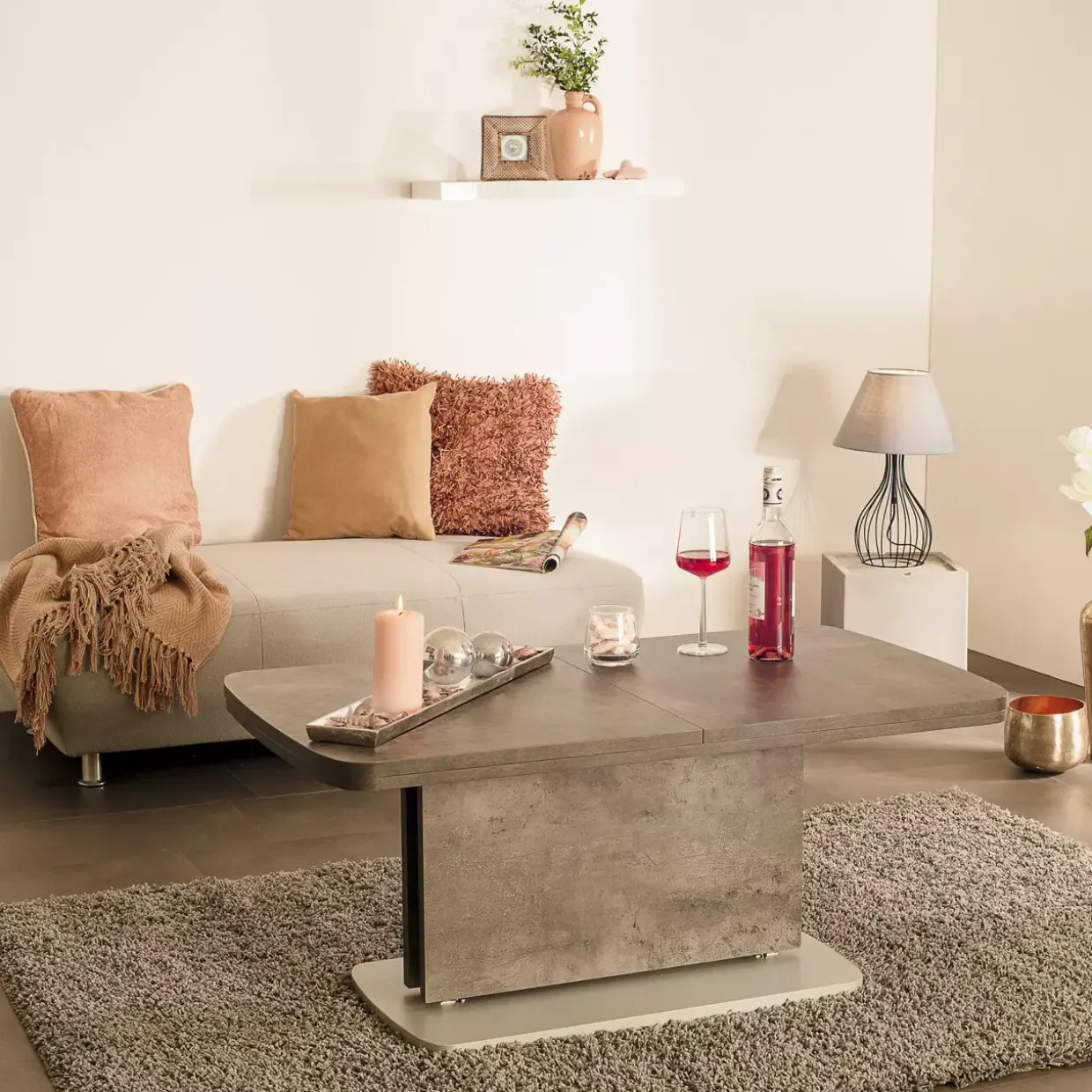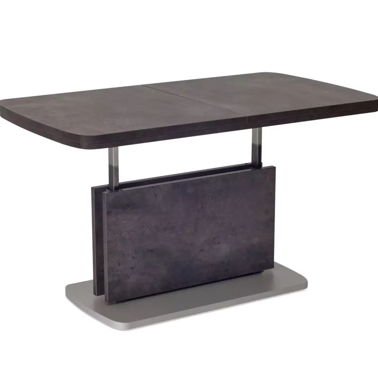 Betonoptik dunkel verleiht diesem modernen Couchtisch eine markante Ausstrahlung, die in jedem Wohnzimmer Akzente setzt. Die raffinierte Kombination aus Holzwerkstoff und Metall sorgt für Stabilität und Langlebigkeit. Ein besonderes Highlight ist die Synchro-Slice-Auszugsmechanik, die es ermöglicht, die Tischfläche zweifach längs auf beeindruckende 145/180 x 63 cm zu erweitern. Diese Funktion bietet Flexibilität bei der Nutzung, sei es für gesellige Abende oder als praktische Ablagefläche.