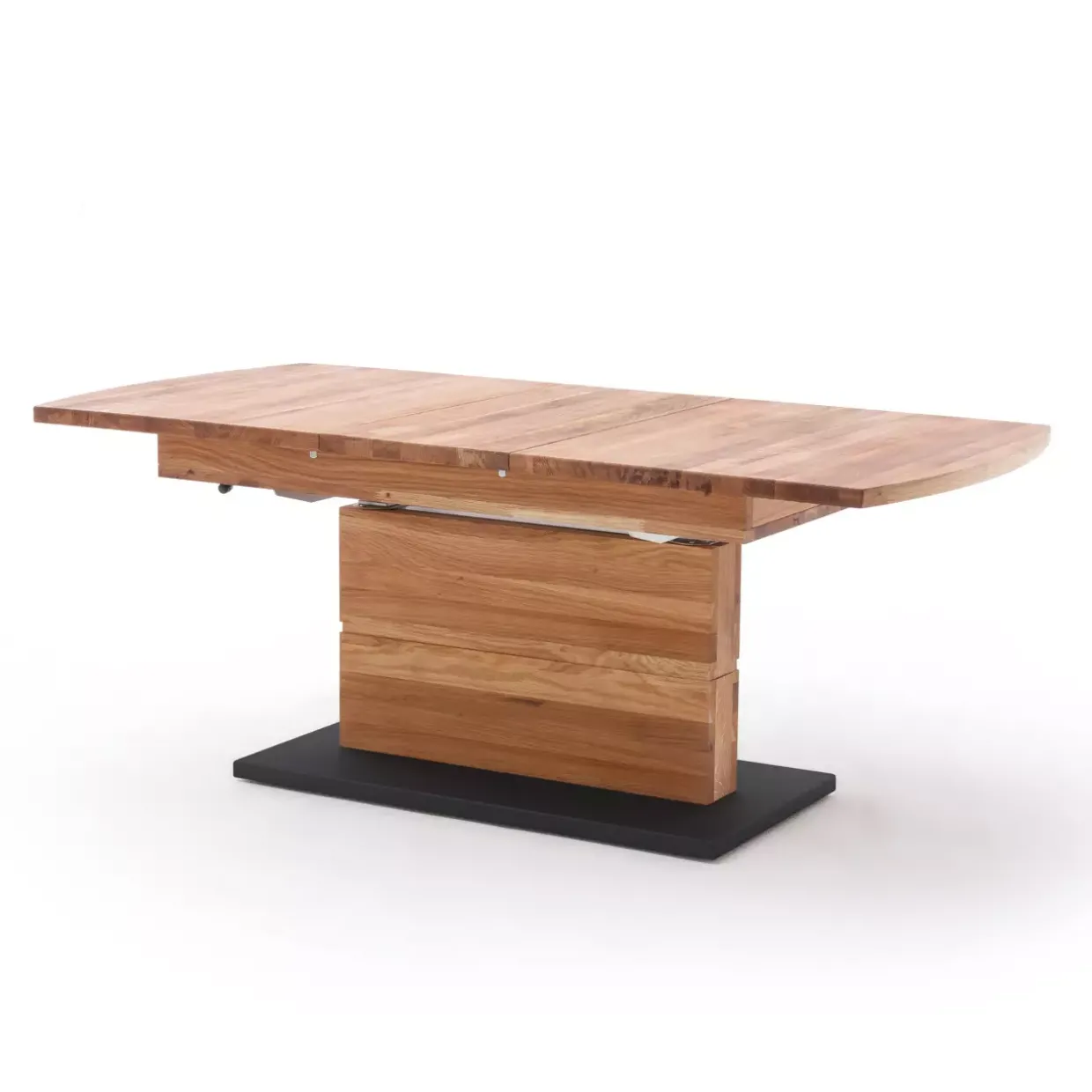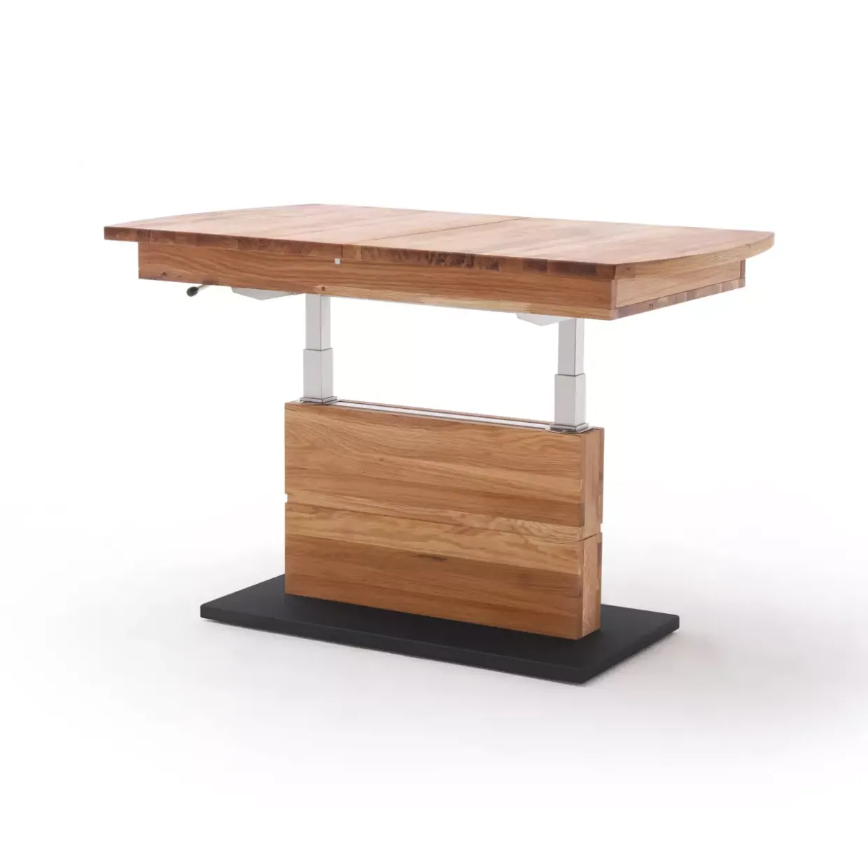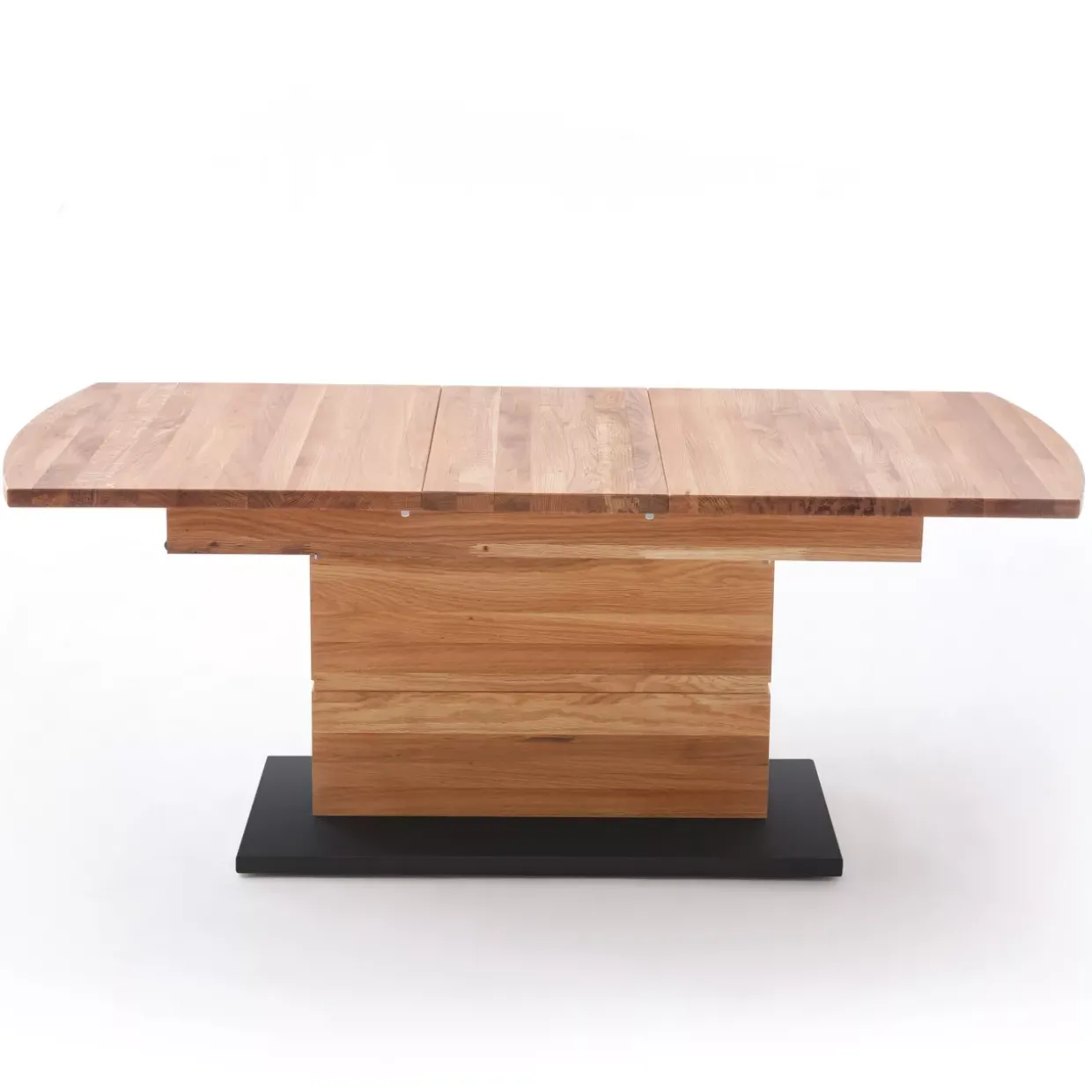 Ein herausragendes Merkmal des Remus Couchtisches ist seine Fähigkeit, sich bis zu einer Länge von 140 cm ausziehen zu lassen. Diese Funktion macht ihn zu einem flexiblen Begleiter für unterschiedliche Wohnsituationen. Die integrierte Einlegeplatte von 30 cm bietet zudem zusätzliche Anpassungsmöglichkeiten. Der Tisch besticht durch sein stilvolles Loft-Design und die elegante rechteckige Form. Gefertigt aus massivem Asteichenholz mit durchgehenden Lamellen, strahlt er natürliche Schönheit und Robustheit aus. Die geölte Oberfläche sorgt für eine angenehme Haptik und unterstreicht die hochwertige Verarbeitung des Materials.Ein weiteres praktisches Highlight ist die manuelle Höhenverstellbarkeit, die durch eine raffinierte Liftfunktion ermöglicht wird. So lässt sich der Couchtisch leicht an unterschiedliche Bedürfnisse und Gelegenheiten anpassen. Die solide Säulenfußform garantiert Stabilität, während der schwarz lackierte MDF-Sockel einen modernen Kontrast setzt.Mit einer Belastbarkeit von bis zu 10 kg im hochgestellten Zustand erweist sich der Remus Couchtisch als funktional und zuverlässig. Diese Kombination aus Flexibilität, Design und Funktion macht ihn zu einer wertvollen Ergänzung für jedes stilbewusste Zuhause. Entdecken Sie, wie dieses Möbelstück Ihrem Wohnraum eine besondere Note verleihen kann.