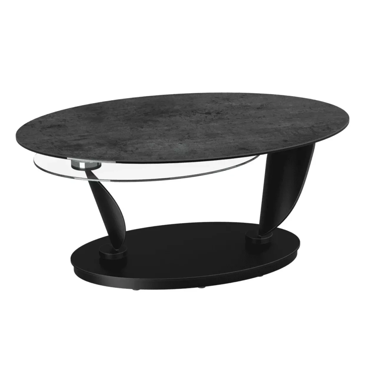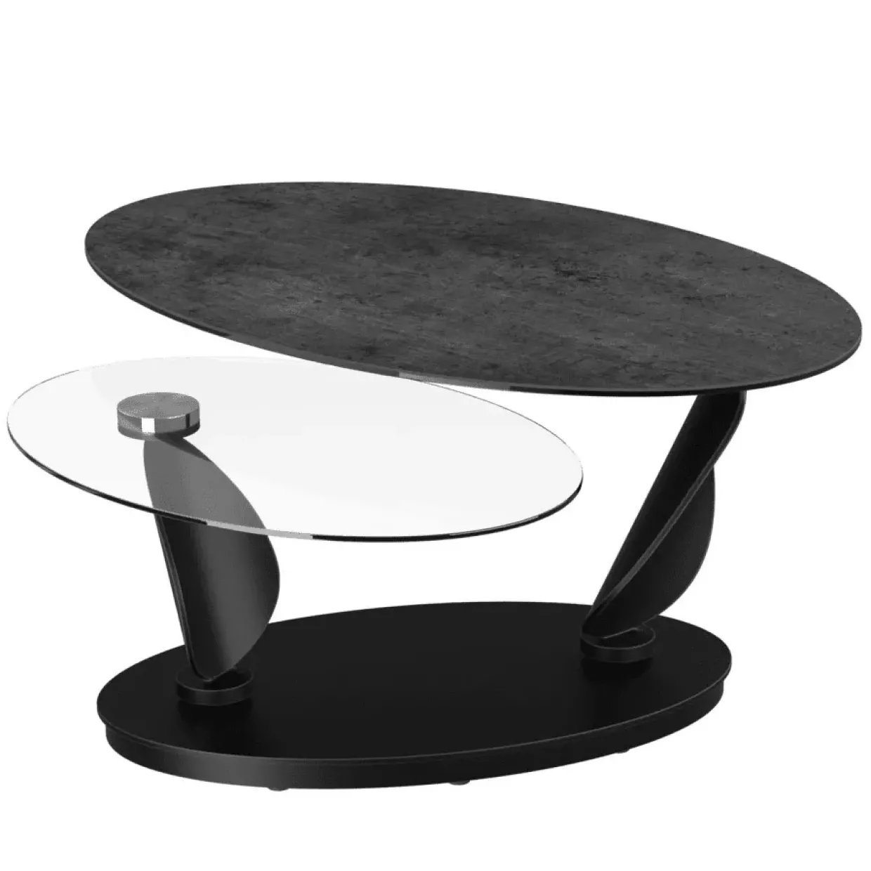 Temperglas von 10 mm Stärke ziert die untere Platte dieses modernen Couchtischs und verleiht ihm eine elegante Note. Die drehbare Funktion dieser Platte ermöglicht es, den Tisch flexibel an Ihre Bedürfnisse anzupassen. Gegensätzlich dazu thront die obere Platte mit einer faszinierenden Kombination aus 3 mm Keramik, geklebt auf 6 mm Glas. Diese spezielle Konstruktion sorgt nicht nur für Stabilität, sondern auch für eine außergewöhnliche Optik.