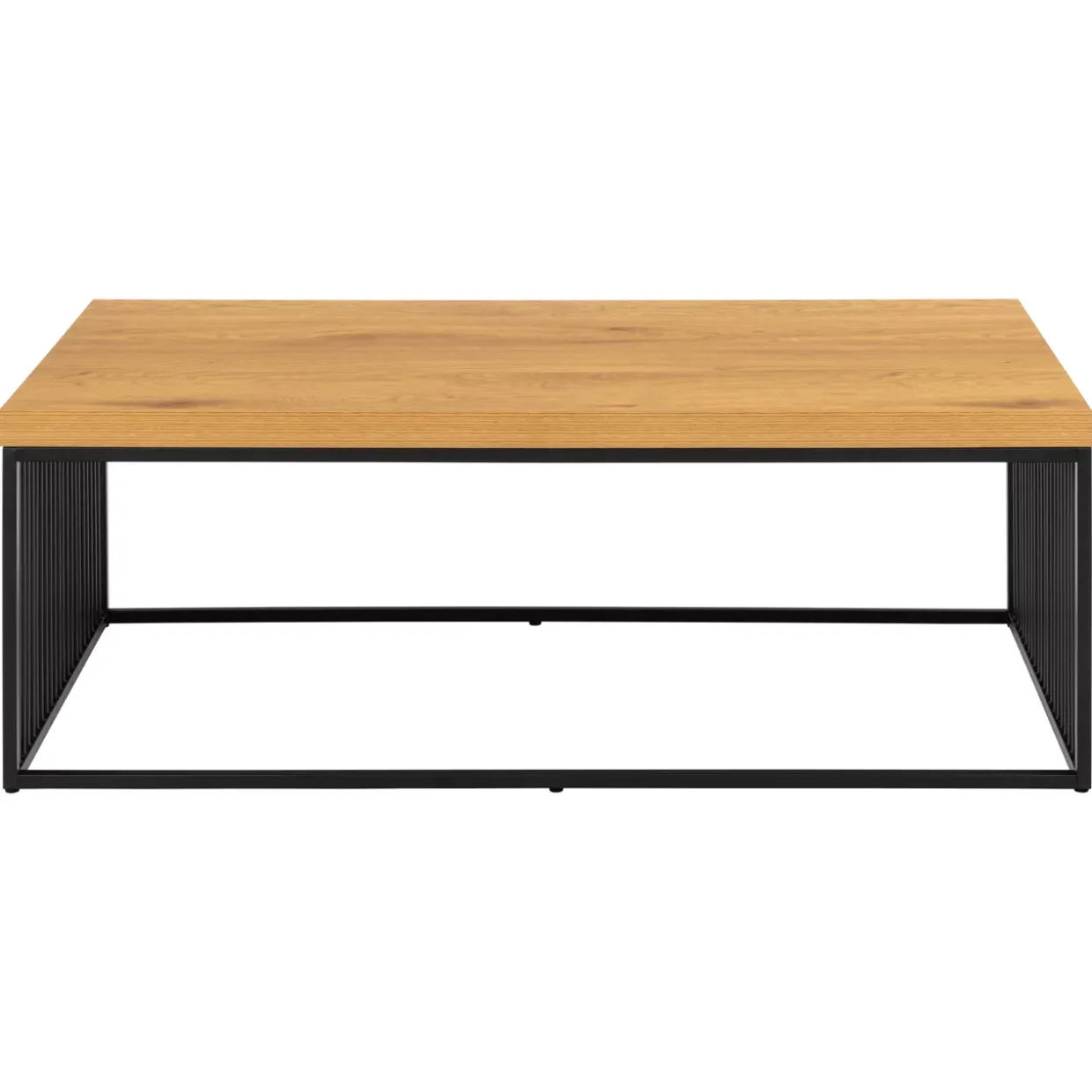 Das Gestell aus schwarzem, matt lackiertem Metall verleiht dem Couchtisch einen industriellen Charme und bildet einen harmonischen Kontrast zur warmen Holzoptik der Platte.
